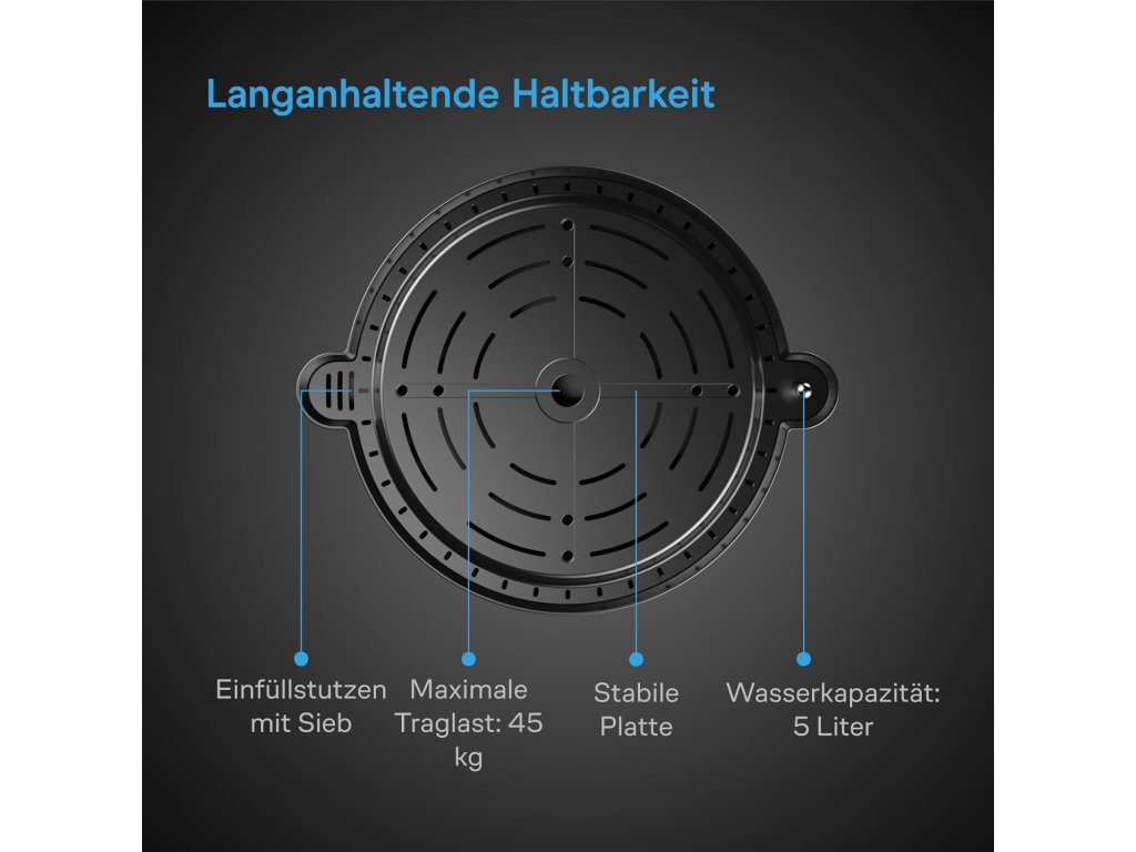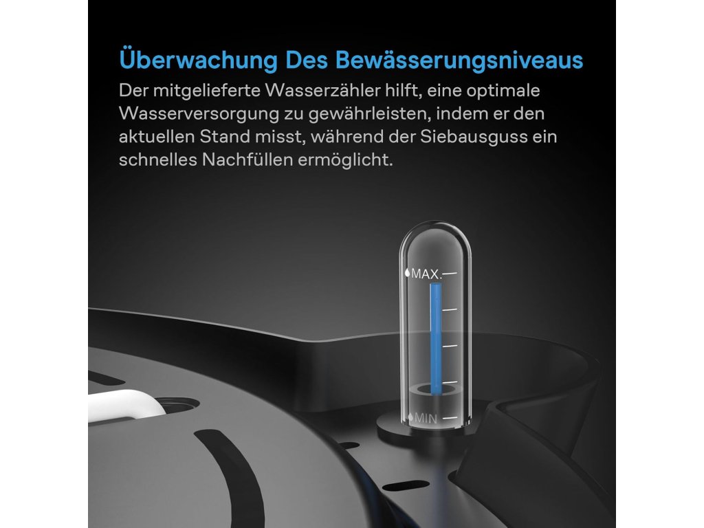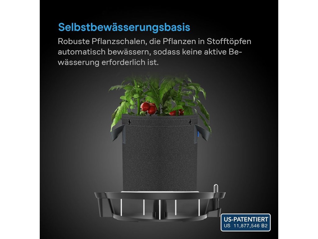 Každá základna je vybavena ukazatelem hladiny vody, který umožňuje snadnou kontrolu množství vody v zásobníku. Zvýšené provedení podporuje zdravý růst kořenů a zlepšuje cirkulaci vzduchu. Systém je vhodný pro pěstování ve sklenících, pěstebních stanech, interiéru i venkovním prostředí.