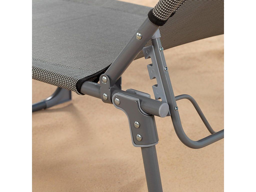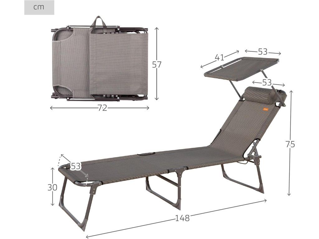 Lehátko je vybaveno nastavitelnou opěrkou zad, měkkým polštářem pod hlavu a praktickou sluneční stříškou, která vás ochrání před přímým sluncem. Konstrukce umožňuje snadné složení a přenášení, což oceníte při cestování nebo skladování.