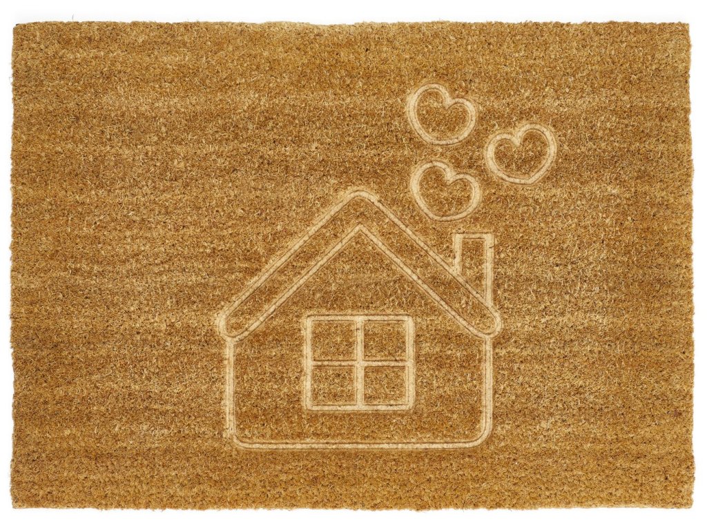 Motiv domečku se srdíčky dodává rohožce osobitý a hřejivý vzhled. Ideální jako vstupní rohož do bytu, domu nebo na terasu.