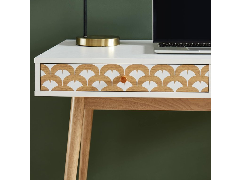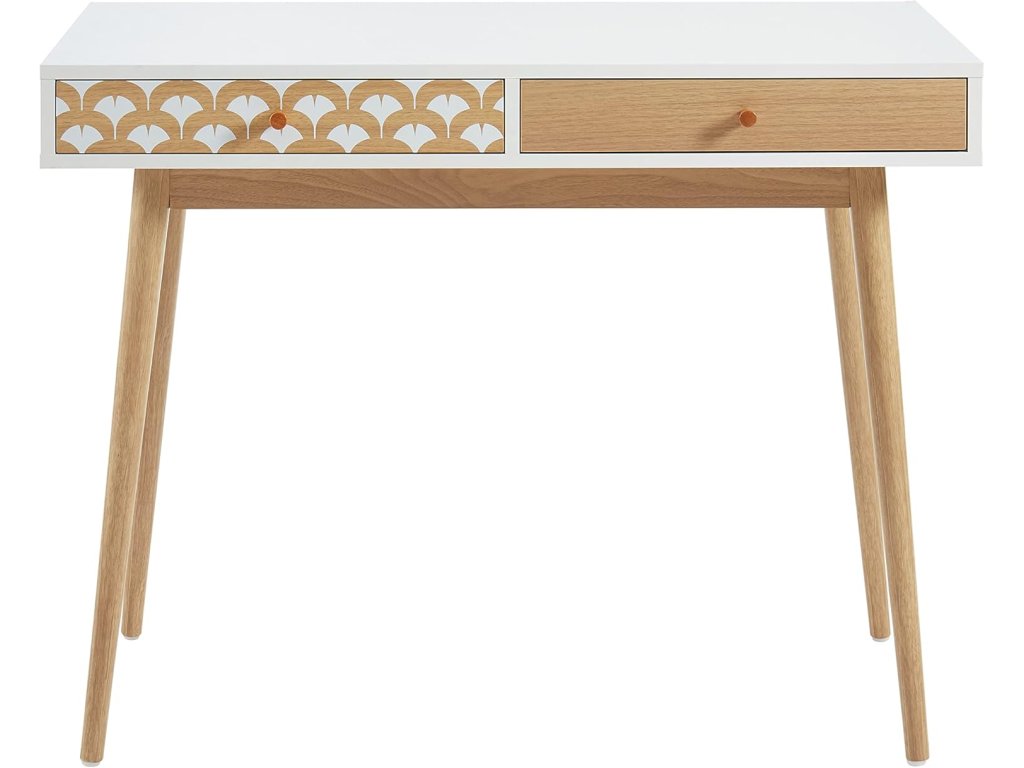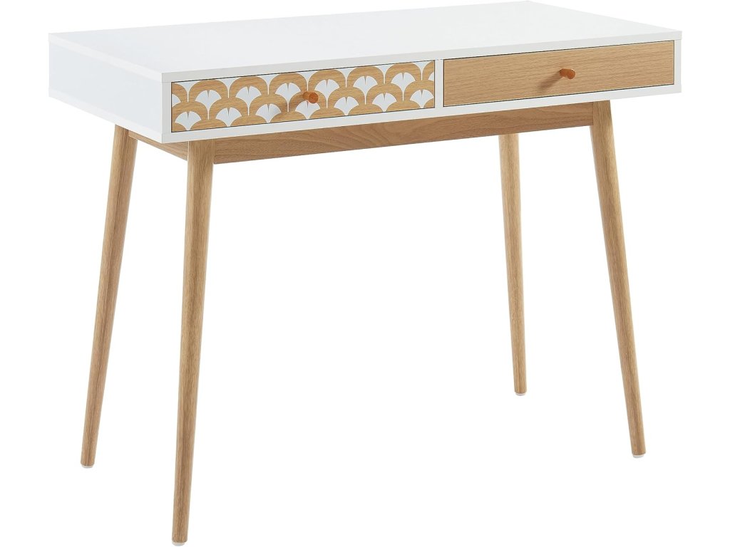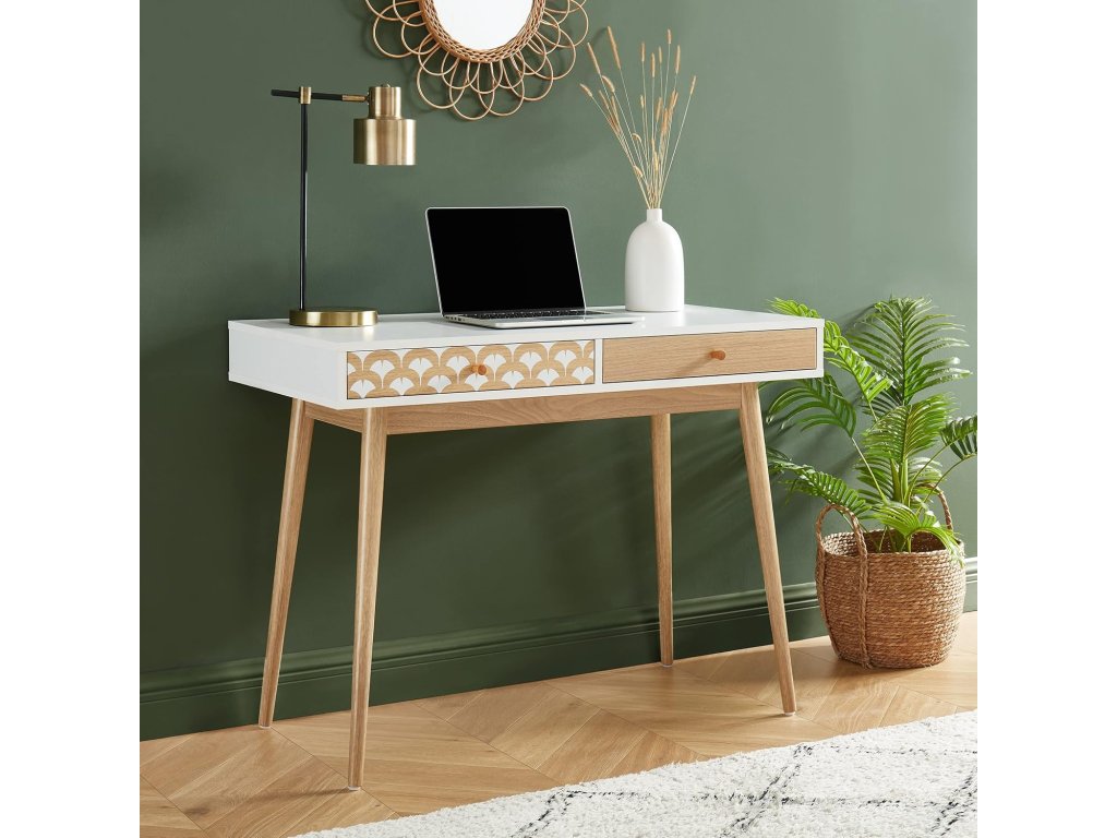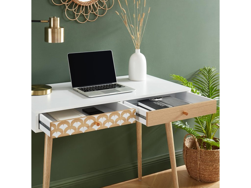 Stůl je vybaven dvěma zásuvkami, které poskytují dostatek úložného prostoru pro kancelářské potřeby. Jedna zásuvka má dekorativní čelní panel, který dodává stolu originální vzhled. Stabilní dřevěné nohy zajišťují pevnost a dlouhou životnost.
