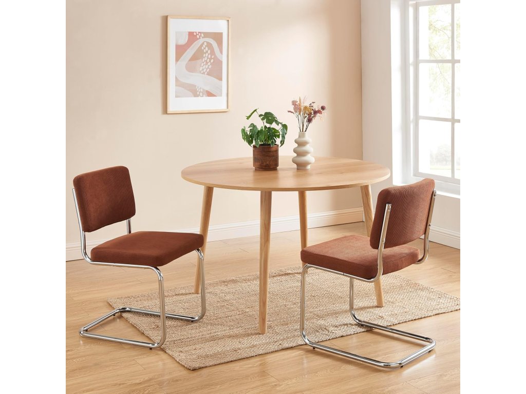 Židle mají měkké polstrování potažené kvalitní kordurovou tkaninou (Cordsamt), která je příjemná na dotek a odolná vůči běžnému opotřebení. Opěradlo je ergonomicky tvarované pro pohodlné sezení během pracovních i volnočasových aktivit.