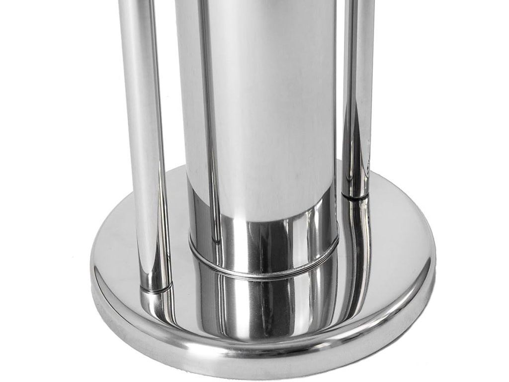 Stojan je vyroben z odolné nerezové oceli s lesklým povrchem, který je snadno udržovatelný a odolný vůči vlhkosti. Kulatá základna zajišťuje dobrou stabilitu i při každodenním používání. WC kartáč je uložen v uzavřené nádobě pro hygienické použití.