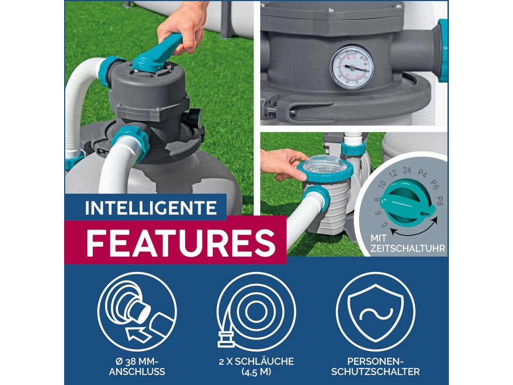 Písková filtrace Bestway je spolehlivý filtrační systém pro udržení křišťálově čisté bazénové vody. Oproti klasickým kartušovým filtracím nabízí vyšší výkon, lepší filtrační schopnosti a jednodušší údržbu.