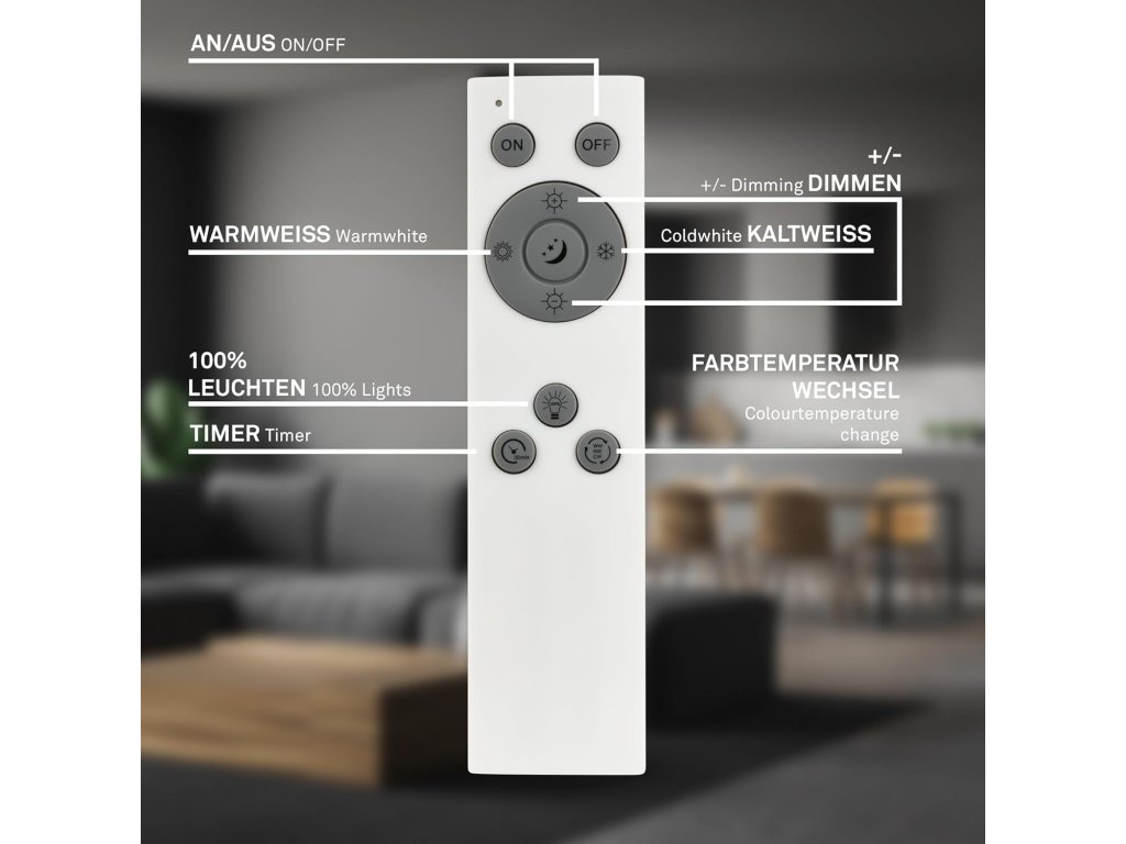 Součástí lampy je dálkové ovládání, které umožňuje pohodlně regulovat intenzitu světla a plynule měnit barvu osvětlení od teplé bílé přes neutrální až po studenou bílou. Světlo lze přizpůsobit denní době i aktuální potřebě.
