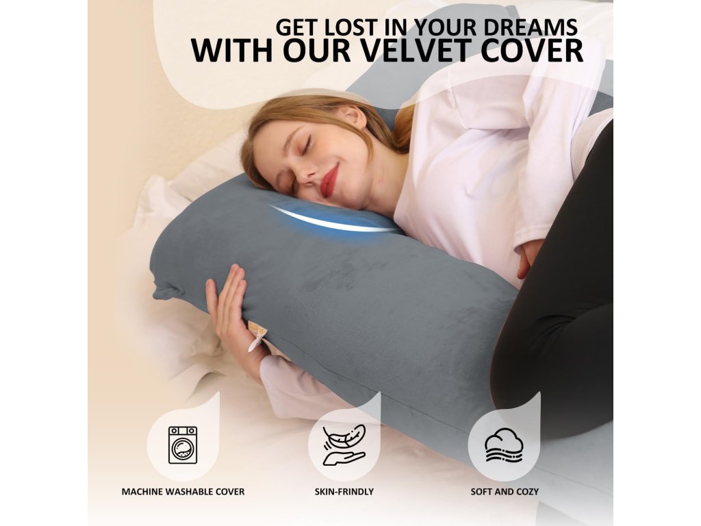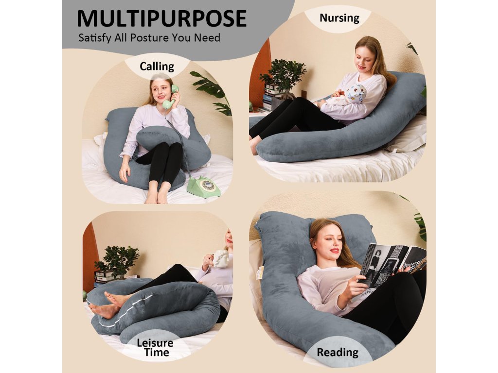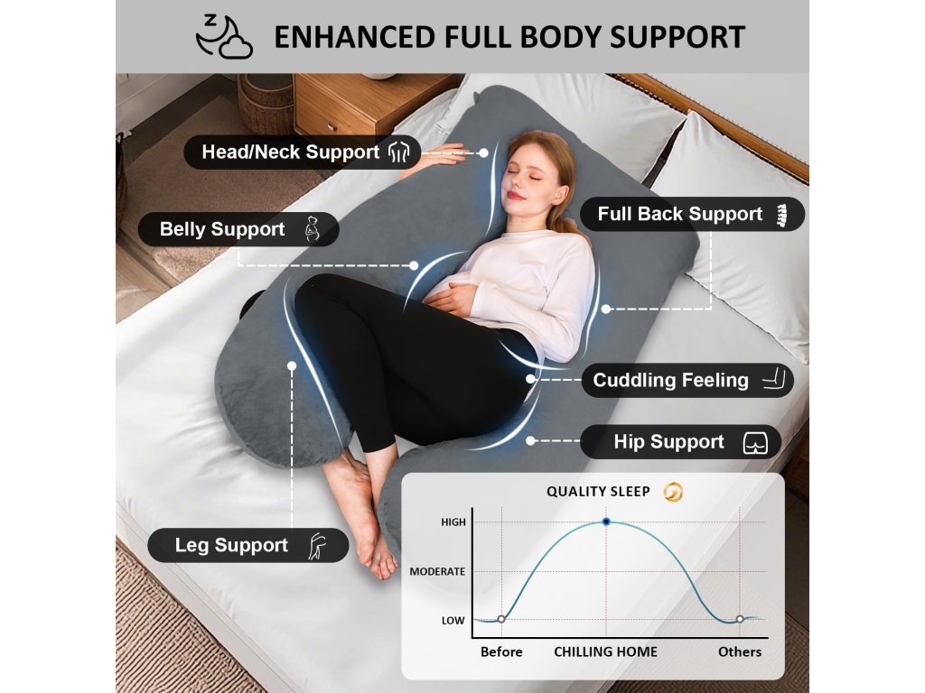 Těhotenský polštář Chilling Home ve tvaru U je navržen pro maximální komfort při spaní na boku. Díky svému ergonomickému tvaru poskytuje oporu celému tělu – hlavě, krku, zádům, břichu i nohám – a pomáhá zmírnit tlak na páteř a klouby.