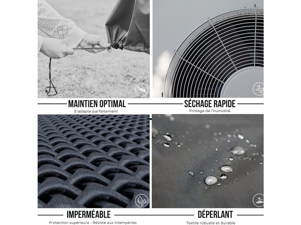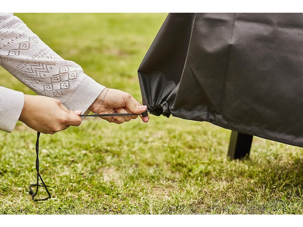 Elegantní černé provedení působí nenápadně a hodí se do každé zahrady či na terasu. Obal je lehký, snadno se nasazuje i sundává a v době nepoužívání jej lze jednoduše složit.