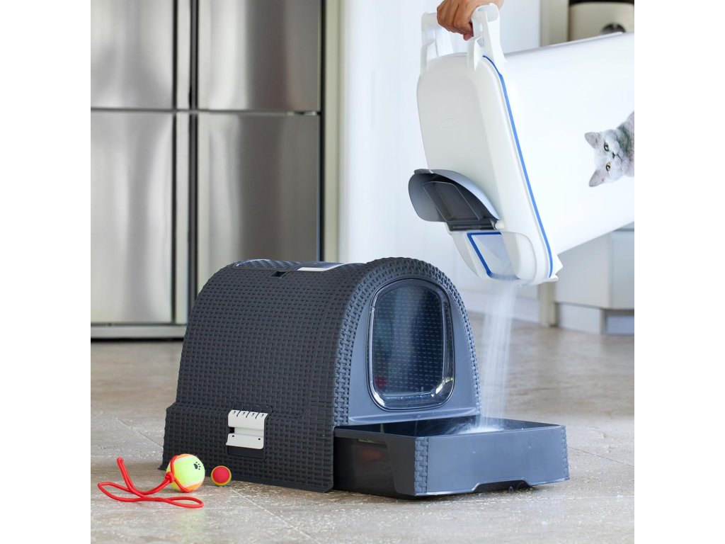 Kočičí toaleta Curver PetLife s víkem je elegantním a praktickým řešením pro každou domácnost s kočkou. Moderní design inspirovaný ratanovým pletivem umožňuje toaletu snadno začlenit do interiéru bez narušení jeho vzhledu.