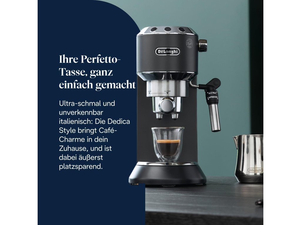 Stylový pákový kávovar De’Longhi Dedica Style EC 685.BK je ideální volbou pro všechny, kteří chtějí připravovat kvalitní espresso i mléčné kávové speciality doma. Díky své šířce pouhých 15 cm se vejde i do velmi malých kuchyní, aniž by slevil z výkonu nebo kvality přípravy.