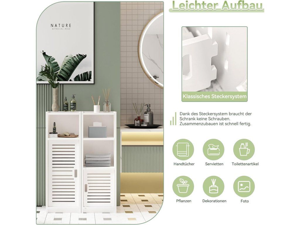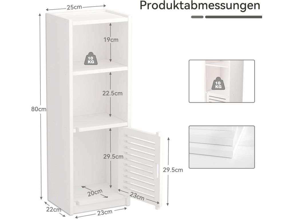 Každá police má nosnost až 10 kg, což zajišťuje stabilní uložení běžných domácích potřeb. Praktická dvířka s větracími otvory jsou ideální například pro uložení hygienických potřeb nebo textilu.
