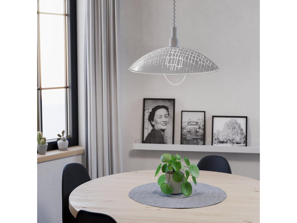 Moderní stínidlo EGLO Alvez zaujme elegantním oblým tvarem a jemným geometrickým dekorem, který vytváří zajímavý světelný efekt po rozsvícení. Je ideální jako dominantní prvek nad jídelní stůl, do obývacího pokoje nebo ložnice.