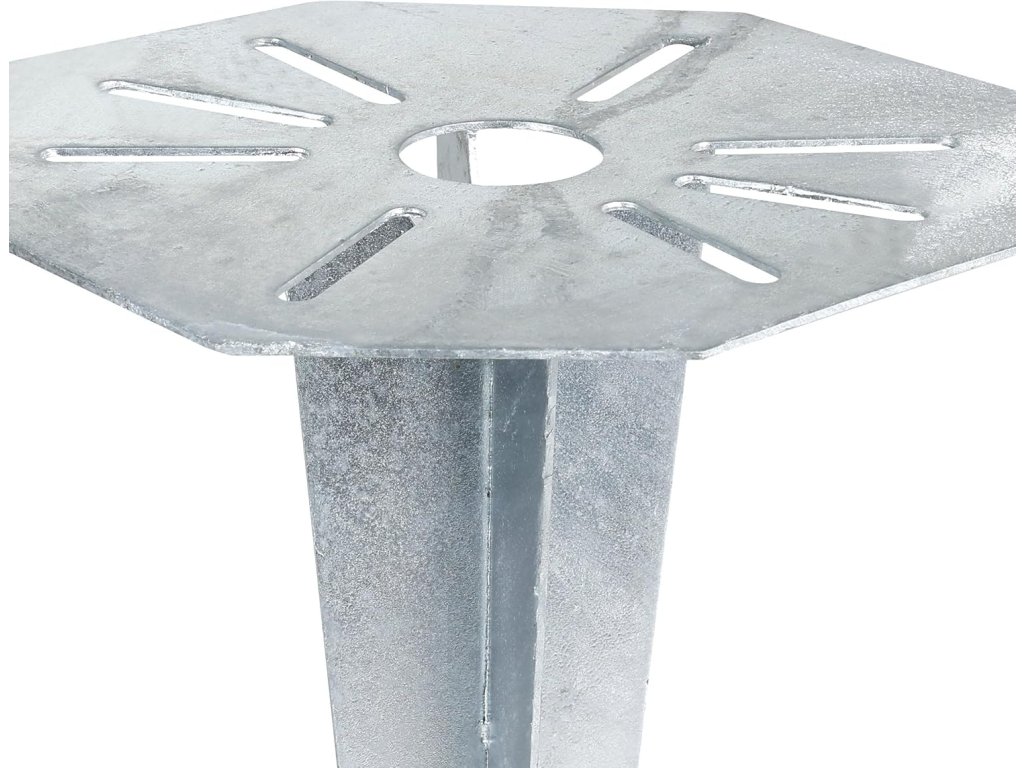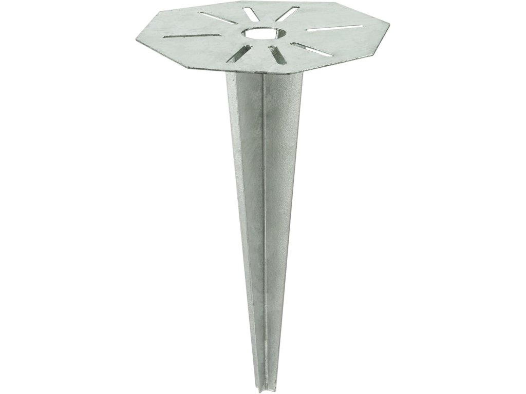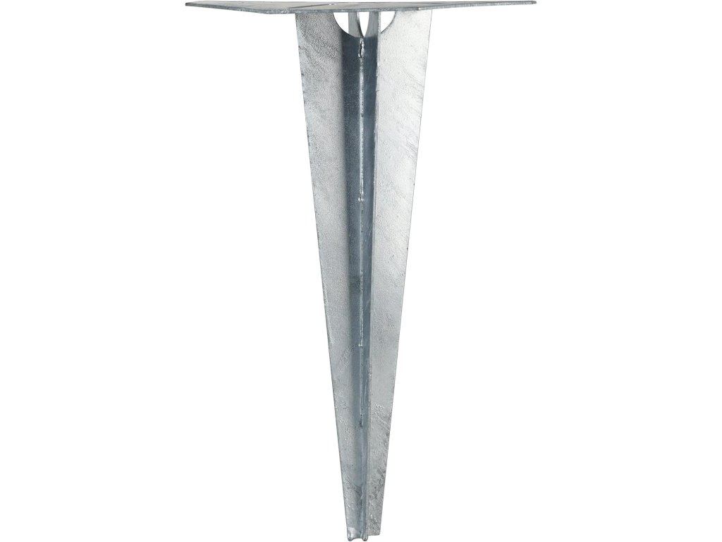 Kolík je vyroben z pozinkovaného kovu, který zajišťuje vysokou odolnost proti korozi a dlouhou životnost při venkovním použití. Pevná konstrukce zaručuje stabilitu i v měkčím terénu.