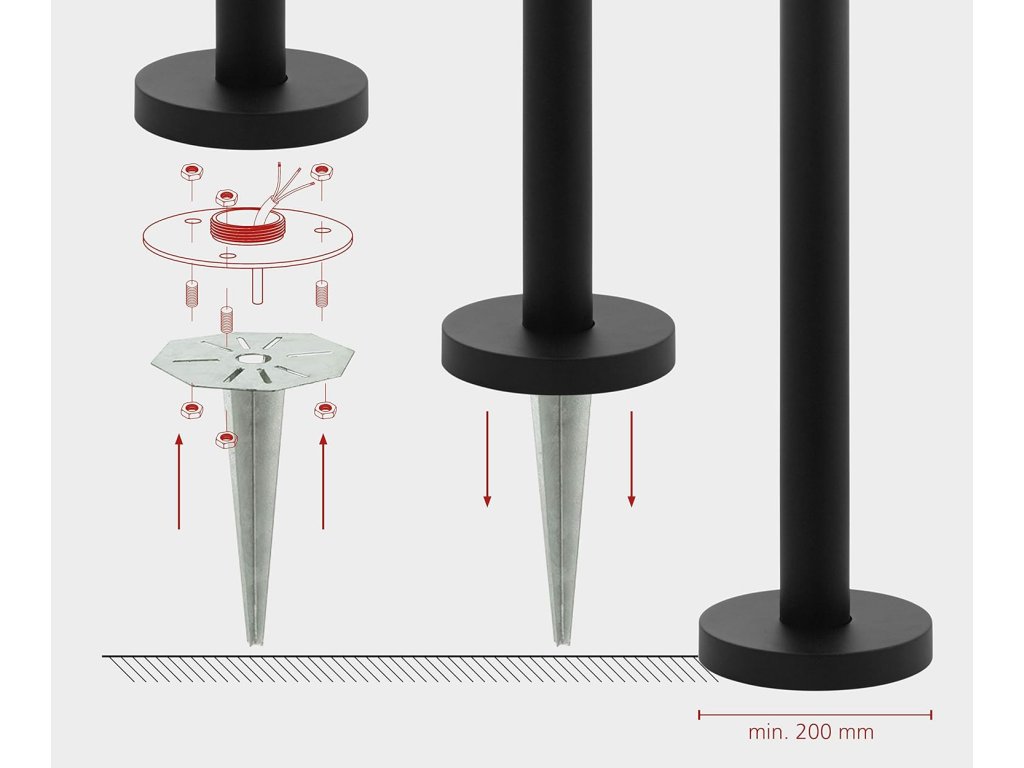 - Vyvrtané otvory v patici venkovní lampy musí mít vzdálenost otvorů min. 4,5 cm a max. 15,5 cm, aby byly kompatibilní se zemním pouzdrem