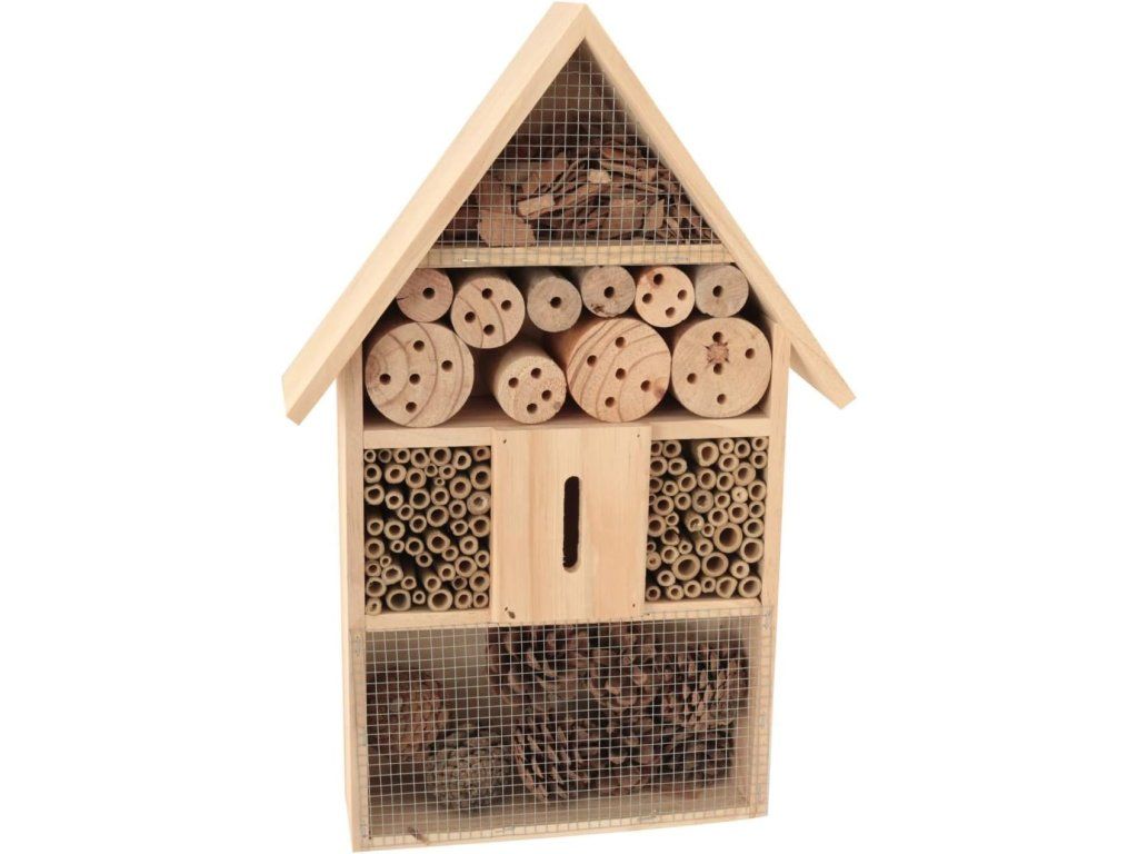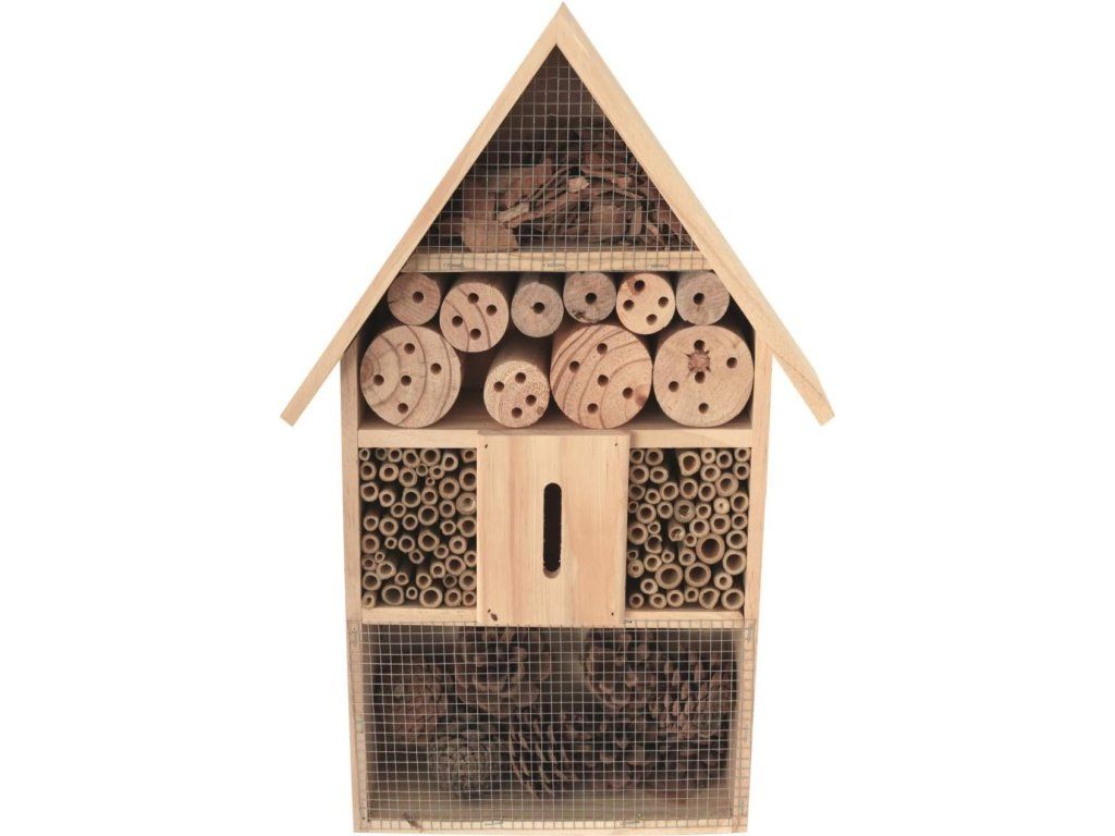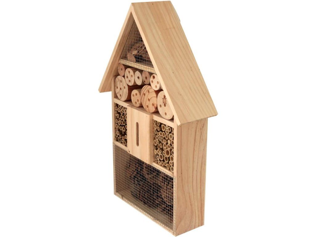 Tento velký dřevěný domeček nabízí různé typy úkrytů, které jsou ideální pro včely samotářky, berušky, motýly i další drobný hmyz.
