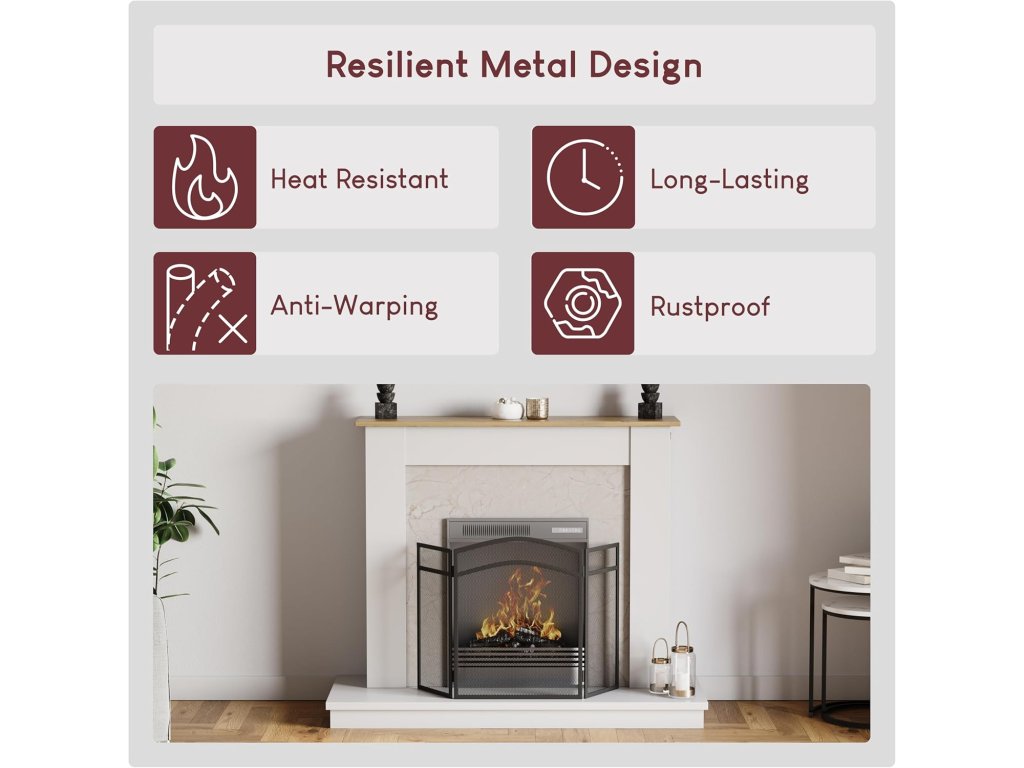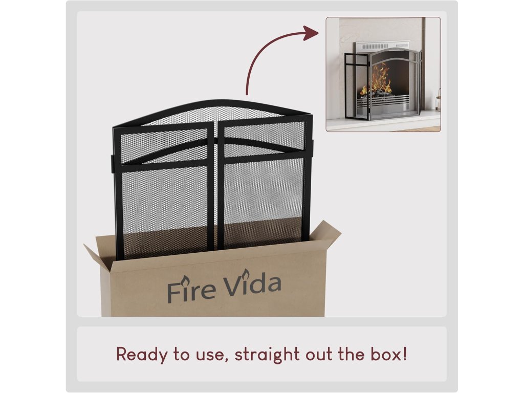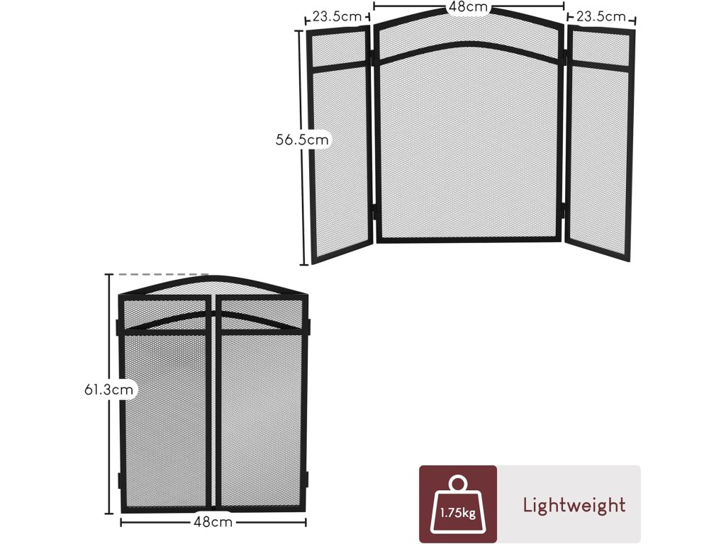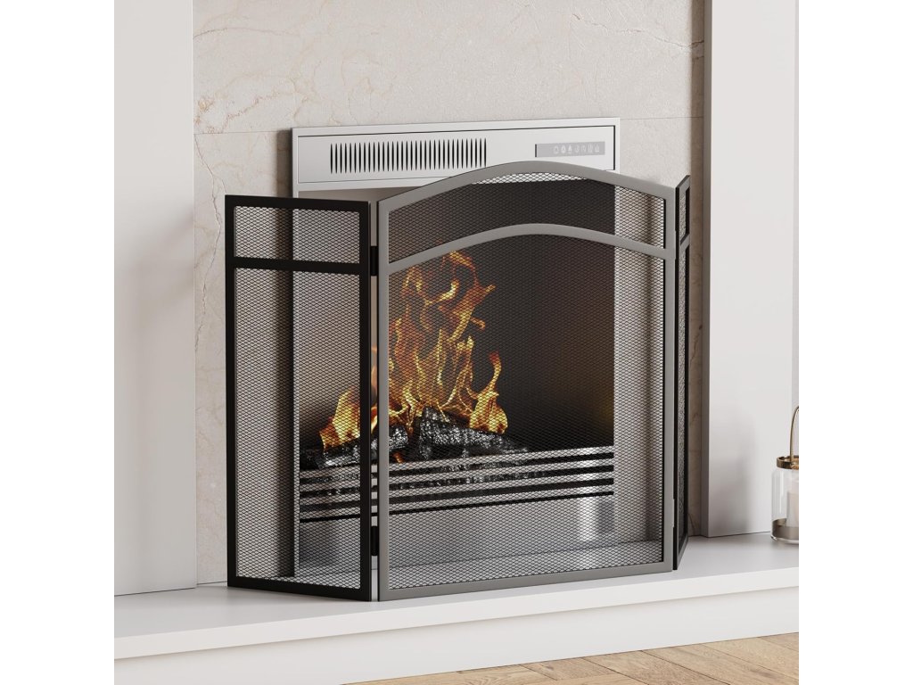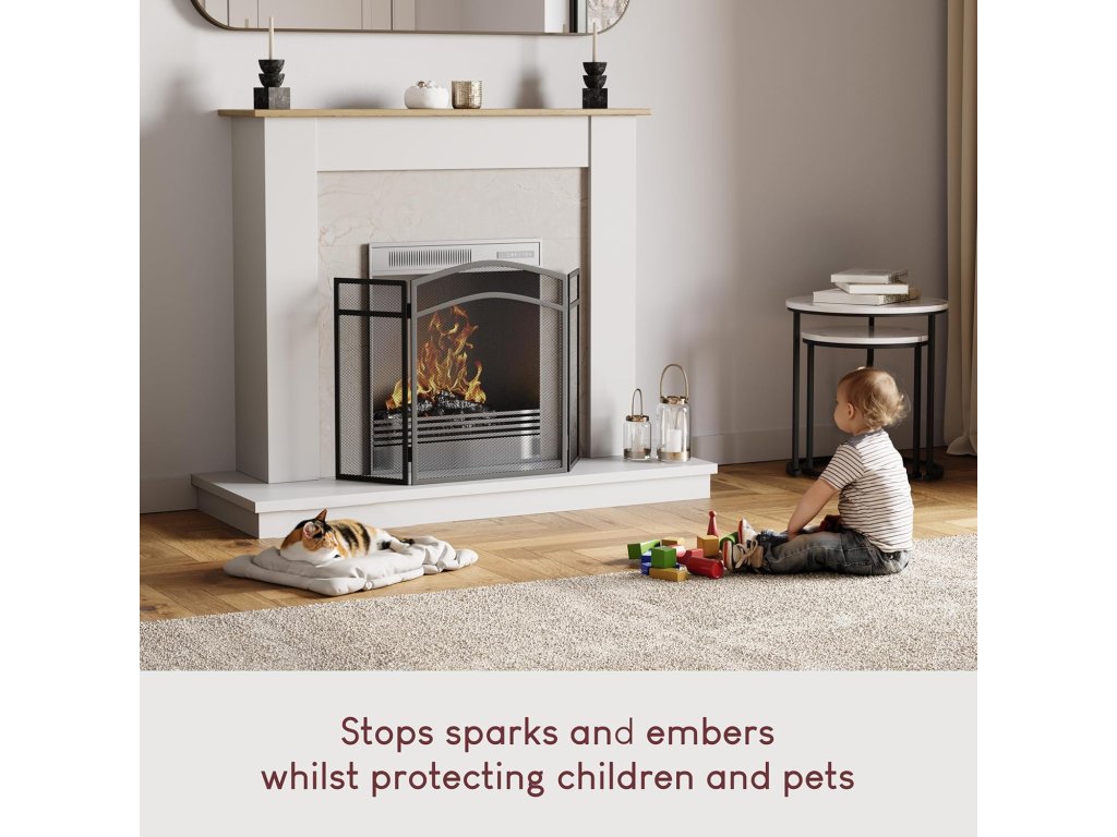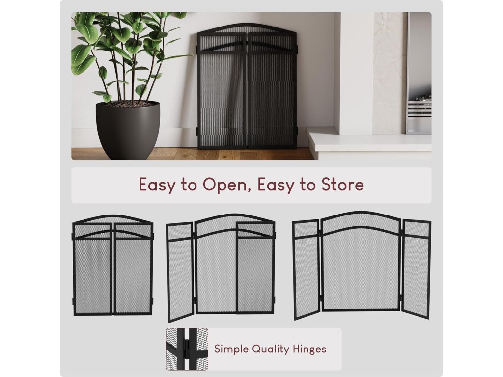 Krbová mřížka má elegantní černé provedení se zakřivenou horní částí, díky čemuž se hodí do moderních i klasických interiérů. Skládací boční panely umožňují snadné přizpůsobení šířky krbu a zároveň zajišťují stabilitu při postavení.