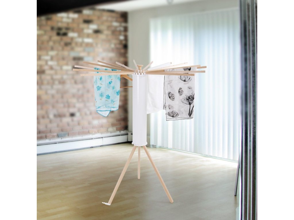 Unikátní konstrukce s otočnou sušicí hlavou nabízí dostatek prostoru pro zavěšení prádla, aniž by zabírala mnoho místa. Stabilní trojnohá základna z bukového dřeva zajišťuje pevnost a bezpečné používání.