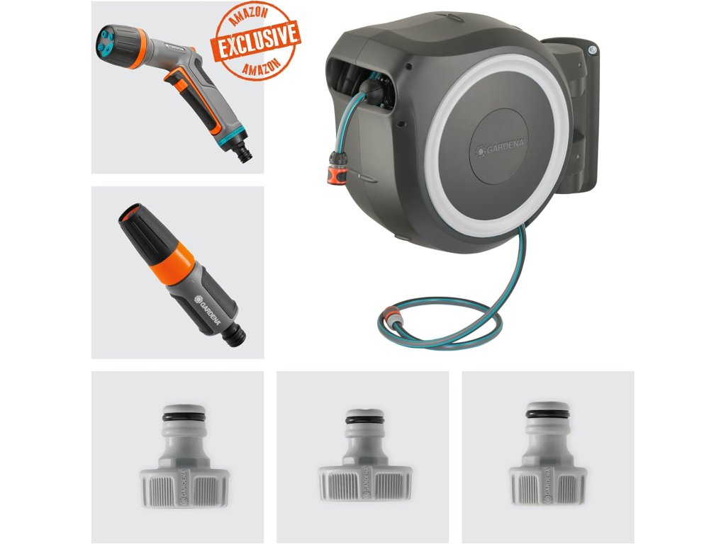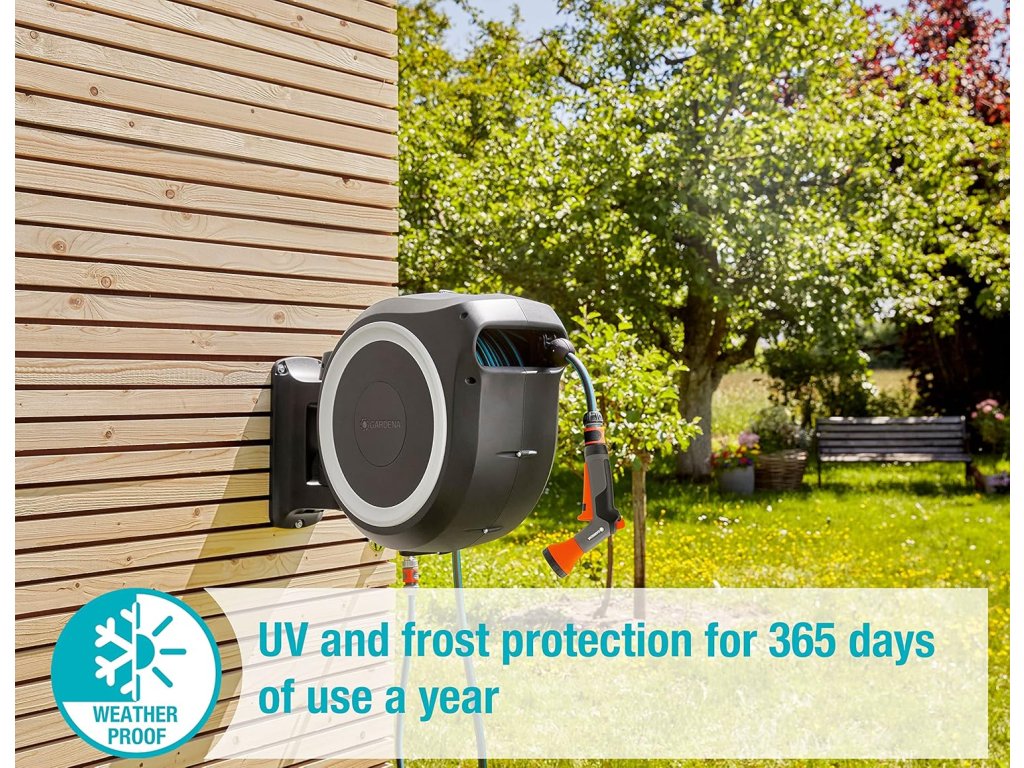 Součástí balení je kvalitní hadice Gardena o délce 30 metrů, čisticí stříkačka i sprcha, takže je box ihned připraven k použití. Odolný kryt chrání hadici před UV zářením i mrazem a zajišťuje dlouhou životnost.
