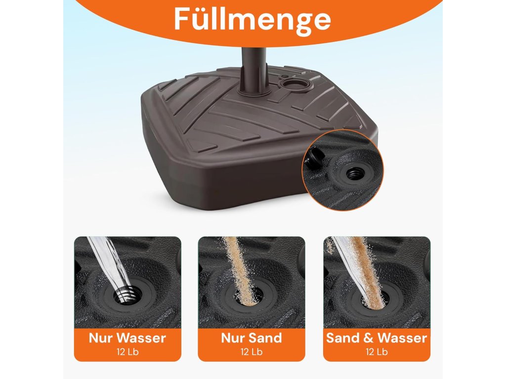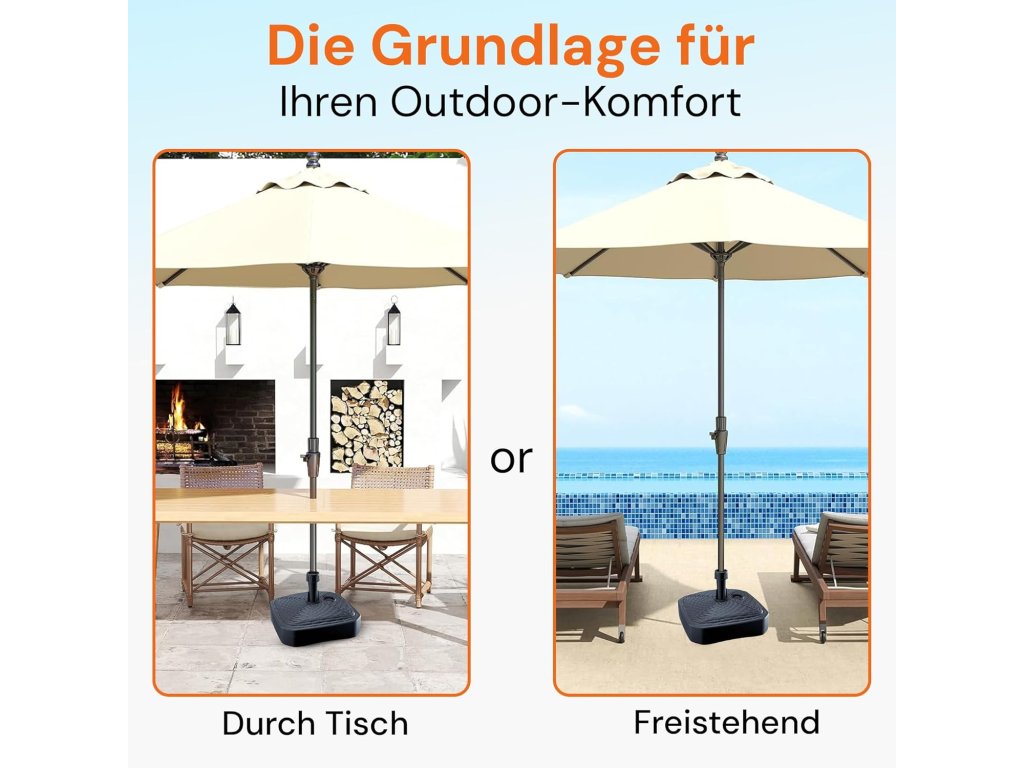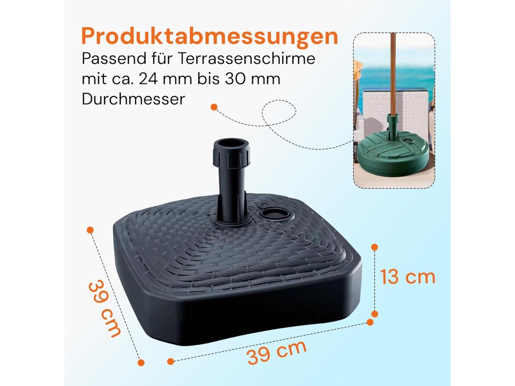 Kvalitní plastové provedení s ratanovým vzhledem působí elegantně a snadno zapadne do venkovního prostředí. Nízká hmotnost v prázdném stavu umožňuje snadnou manipulaci, zatímco po naplnění stojan pevně drží slunečník na místě.