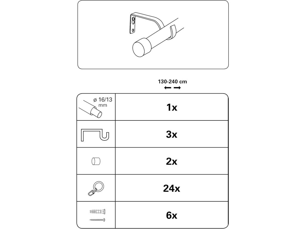 - 1× výsuvná záclonová tyč 130–240 cm