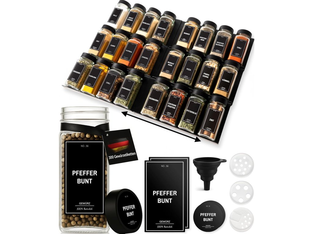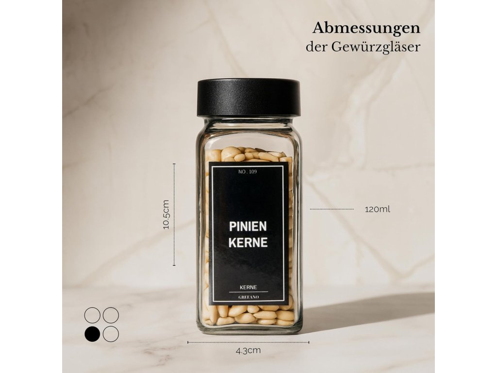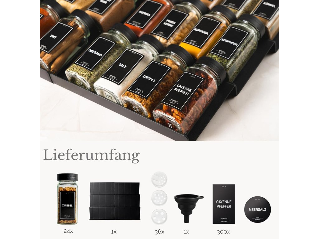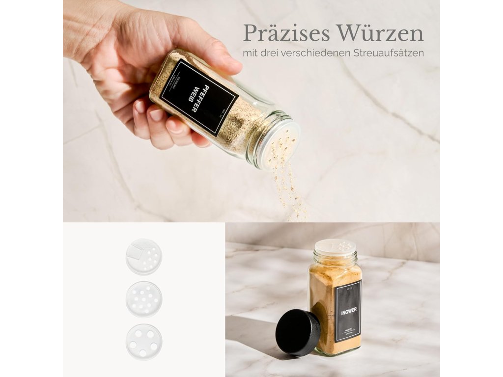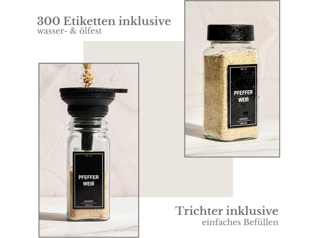 Součástí sady jsou také stylové etikety na koření včetně prázdných štítků, trychtýř pro snadné plnění a různé typy sypacích vložek. Elegantní černo-skleněný design se hodí do moderní i klasické kuchyně.