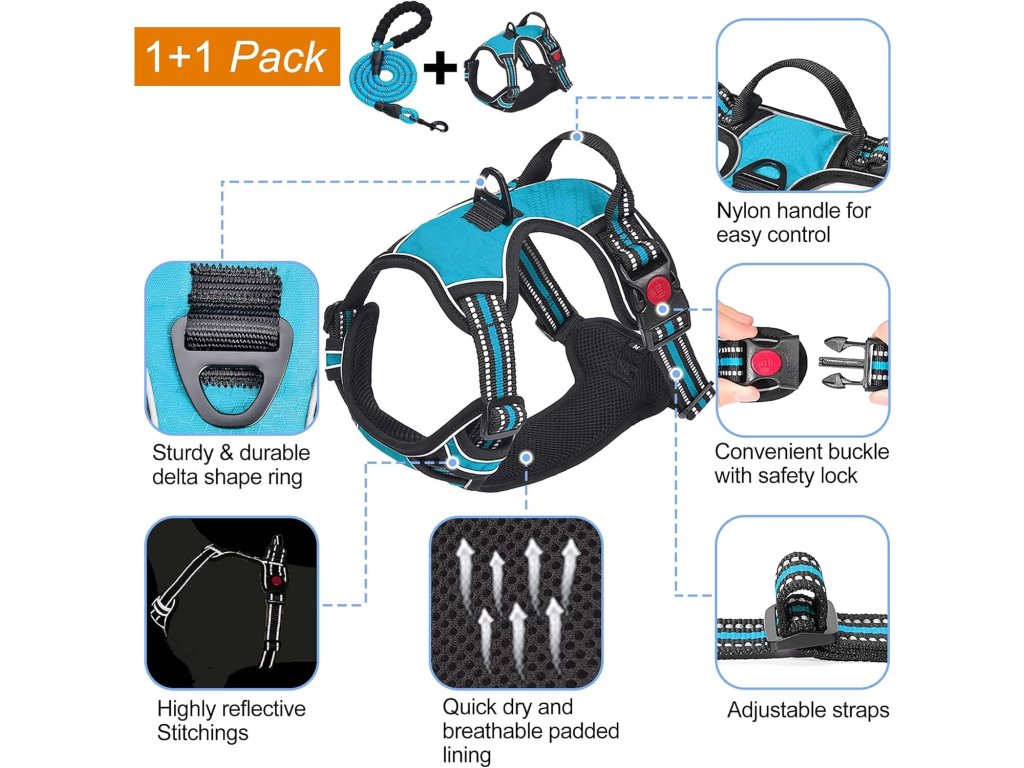 Haapaw No Pull postroj pro psy s vodítkem, reflexní, nastavitelný, modrý, model DH-6