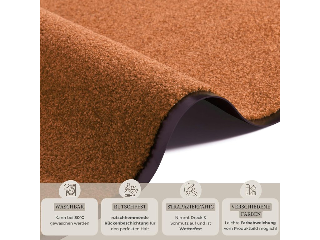 Povrch rohožky je vyroben z odolného syntetického vlákna, spodní část tvoří protiskluzová vrstva pro lepší stabilitu na podlaze. Oranžová barva dodá vstupnímu prostoru svěží a výrazný vzhled.