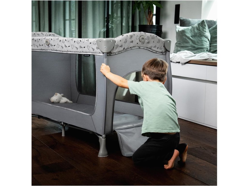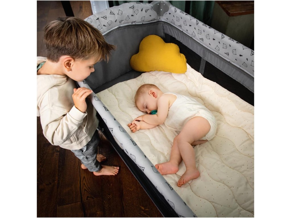 Postýlka je vybavena závěsným lůžkem pro novorozence, které šetří záda rodičů při ukládání miminka. Součástí je také přebalovací podložka, která umožňuje pohodlnou péči o dítě kdykoliv a kdekoliv.