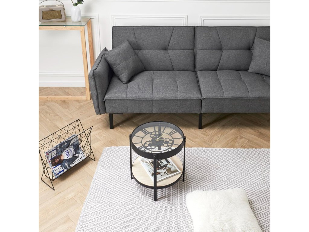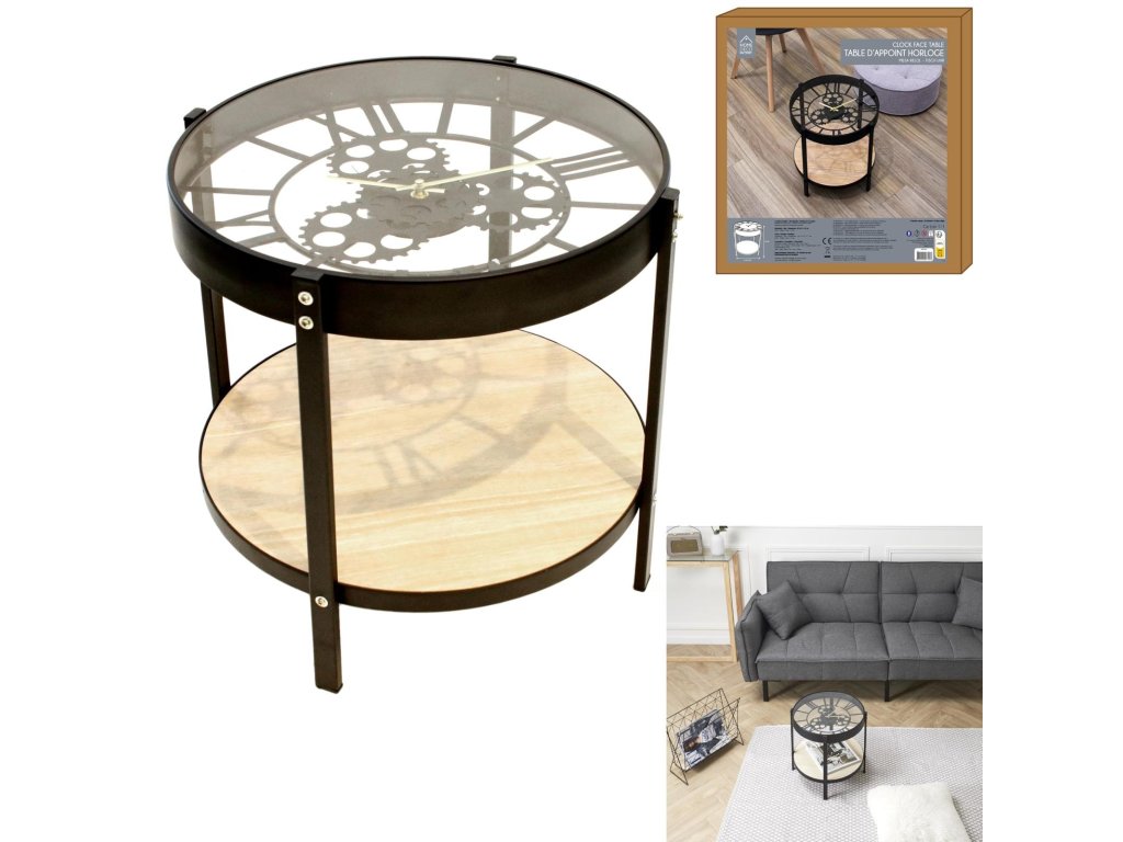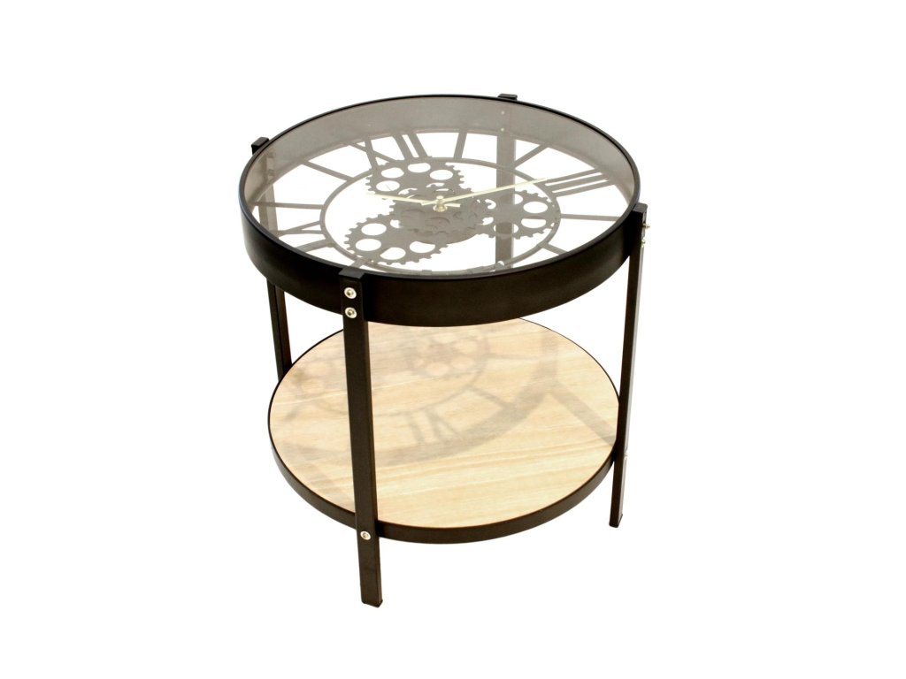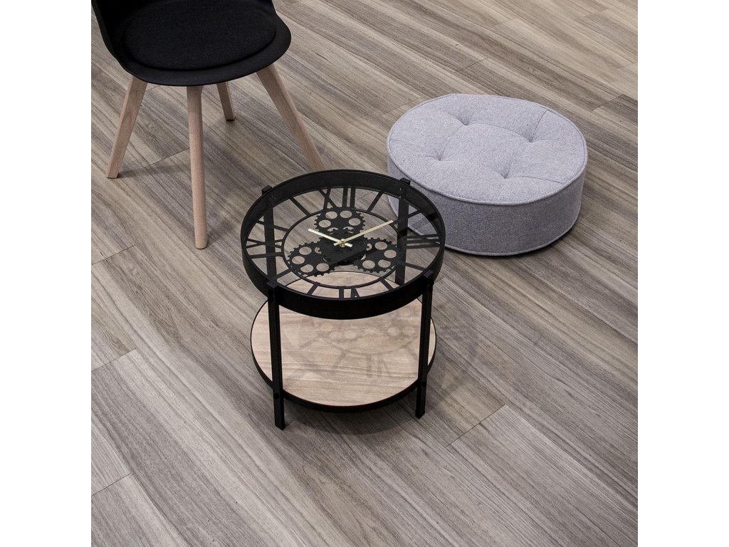Stylový servírovací stolek HOME DECO FACTORY kombinuje moderní industriální vzhled s originálním ciferníkem hodin umístěným pod skleněnou deskou. Kovová konstrukce je pevná a stabilní a spodní dřevěná police poskytuje další úložný prostor pro knihy, dekorace nebo drobnosti.