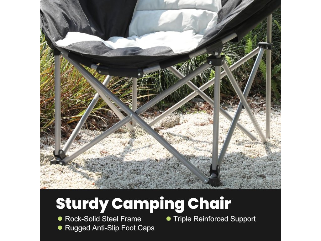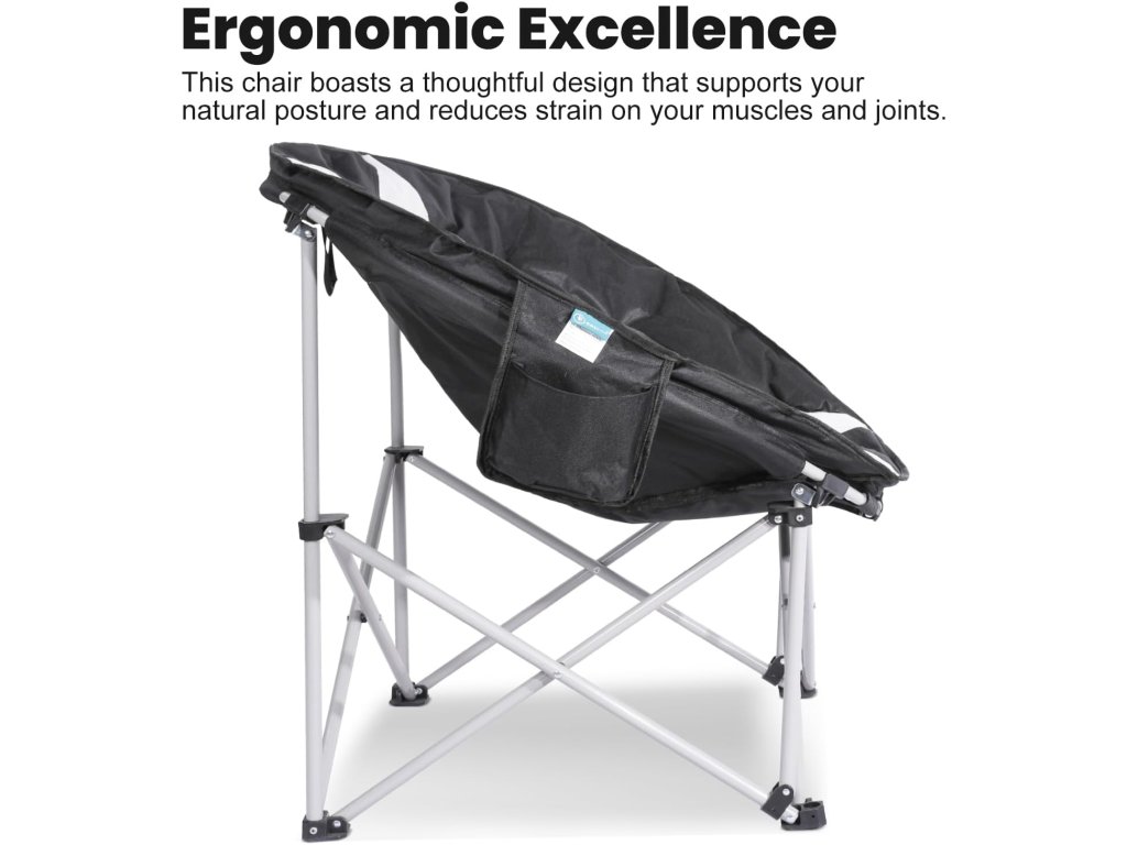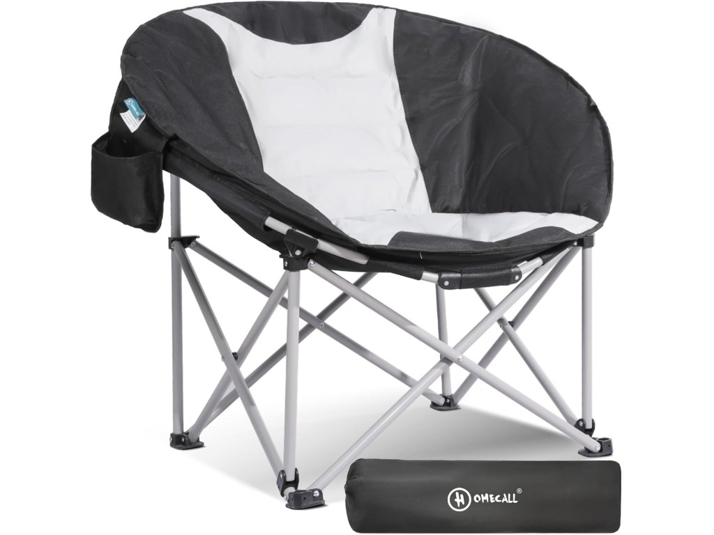 Homecall skládací kempinkové křeslo XXL 30054 nabízí komfortní posezení i při venkovním pobytu — díky prostornému sedadlu ve stylu “měsíčního” křesla se pohodlně usadí i větší postava.