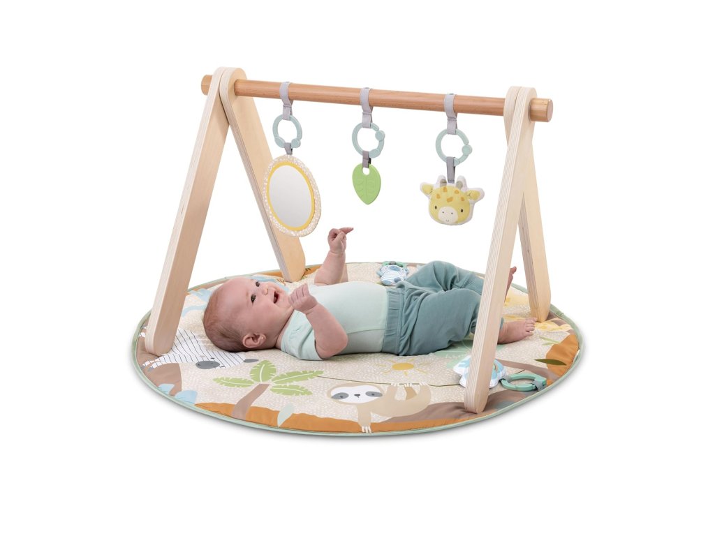 Dětská hrací podložka Ingenuity Wonder & Wood kombinuje moderní design s funkčností a podporuje přirozený vývoj miminka již od narození. Dřevěná skládací hrazda ve tvaru A poskytuje stabilitu a prostor pro zavěšení hraček.