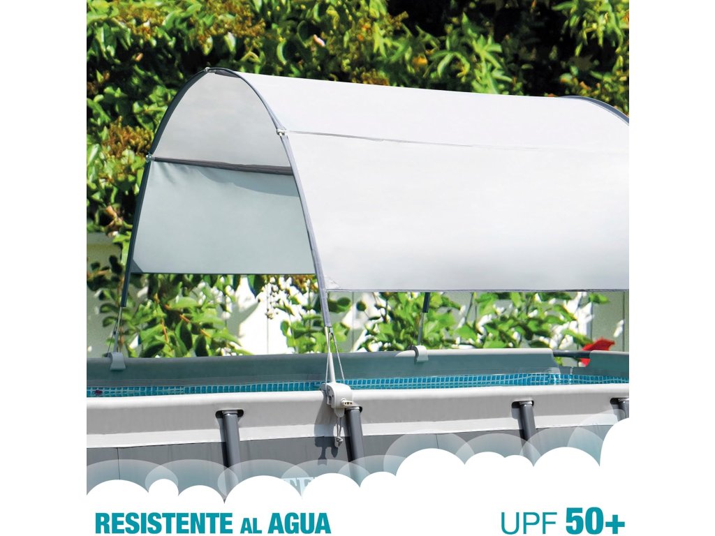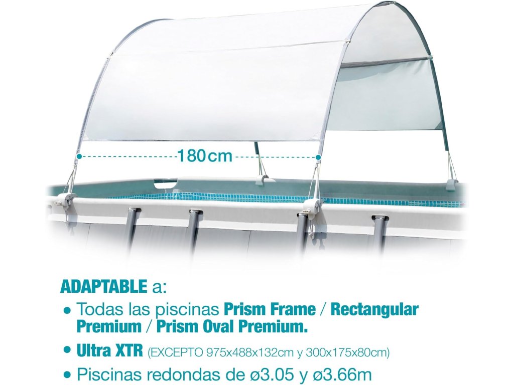 Stříška je určena především pro obdélníkové bazény Intex do délky 9 stop (cca 2,75 m). Lehká, ale pevná konstrukce s obloukovým rámem zajišťuje stabilitu a odolnost proti běžným povětrnostním podmínkám.