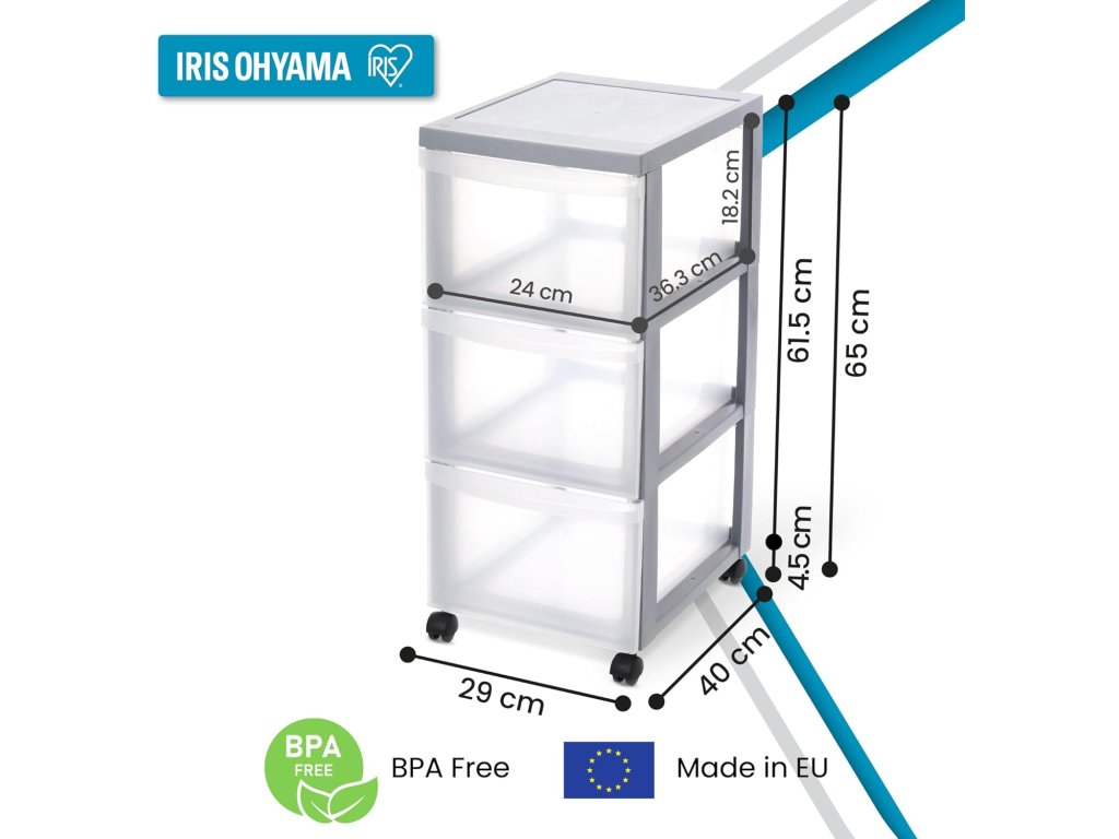 Plastový úložný box Iris Ohyama DC-303 je ideální řešení pro organizaci prostoru v domácnosti, kanceláři nebo dílně. Díky třem hlubokým zásuvkám typu A4 rychle uložíte dokumenty, sešity, kancelářské potřeby i různé doplňky. Box je vybaven kolečky, takže ho snadno přesunete podle potřeby.
