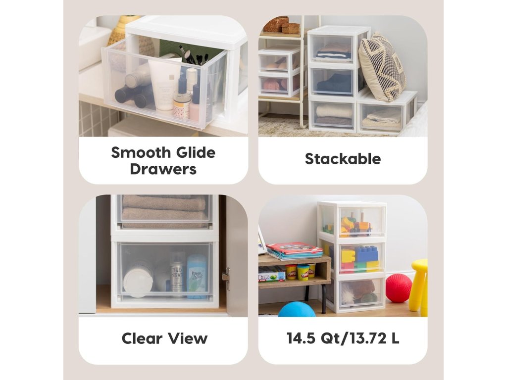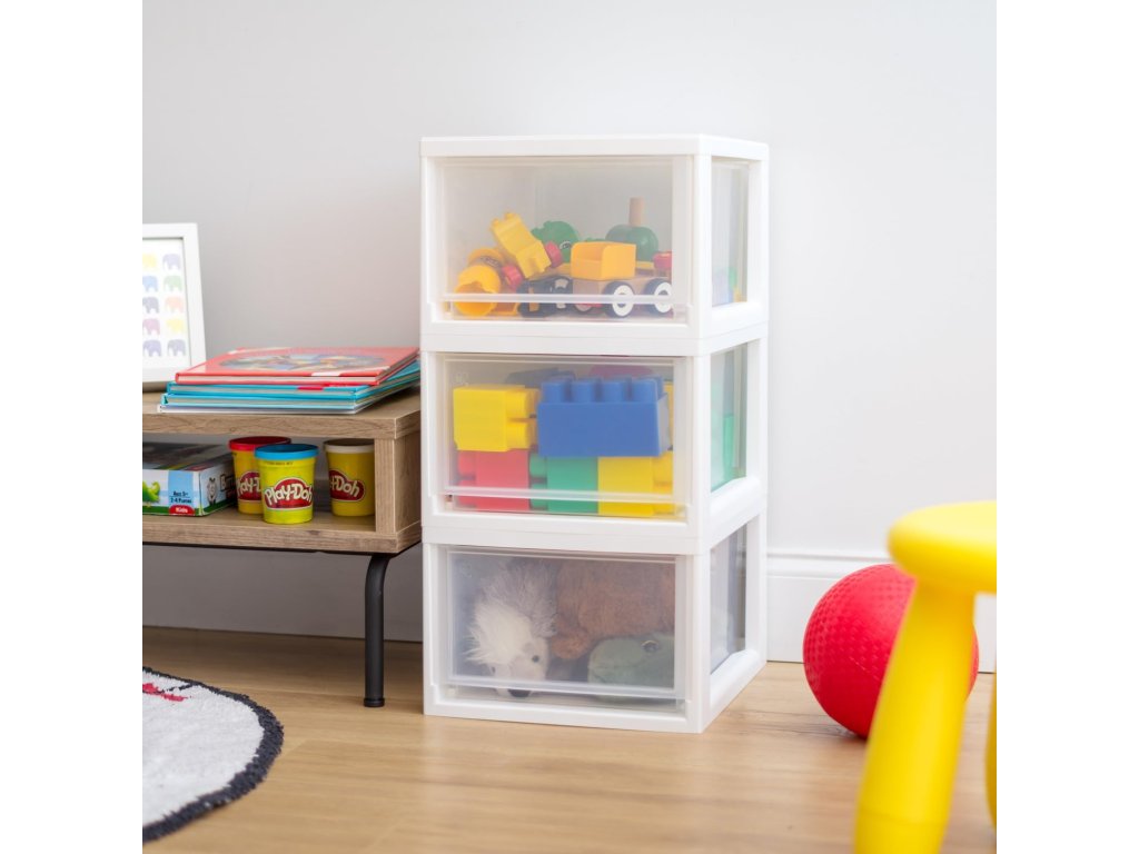 Transparentní zásuvky umožňují okamžitý přehled o uloženém obsahu bez nutnosti otevírání. Boxy jsou vyrobeny z kvalitního plastu bez BPA, který je bezpečný pro ukládání potravin, léků i dětských potřeb.