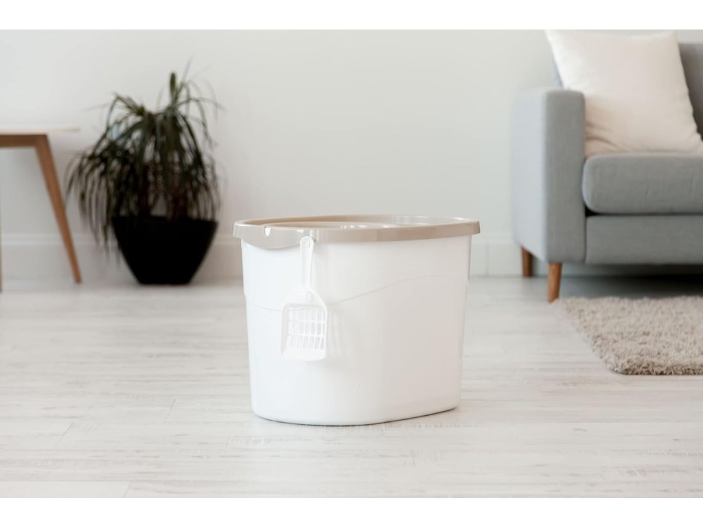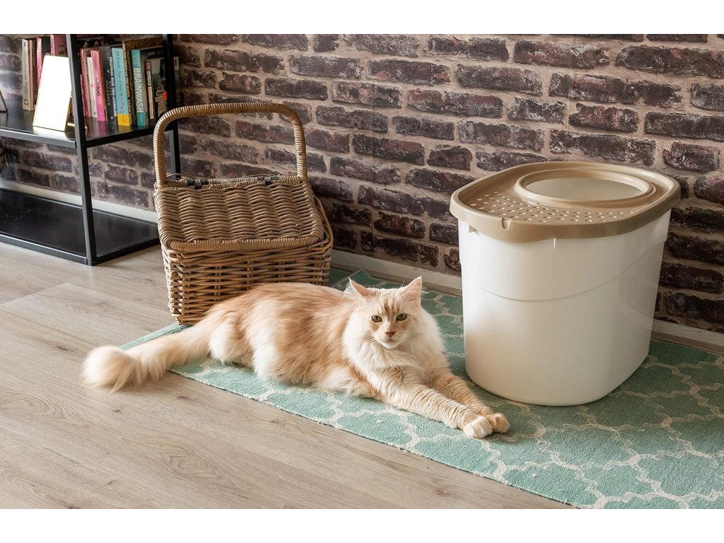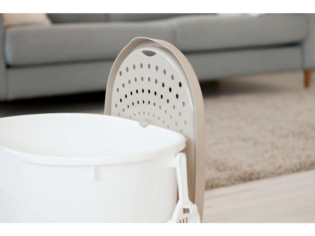 Díky velkému vnitřnímu prostoru je toaleta ideální i pro větší plemena koček nebo domácnosti s rostoucími koťaty. Víko s otvorem usnadňuje vstup a výstup, zatímco perforovaná horní část pomáhá zachytit stelivo z tlapek.