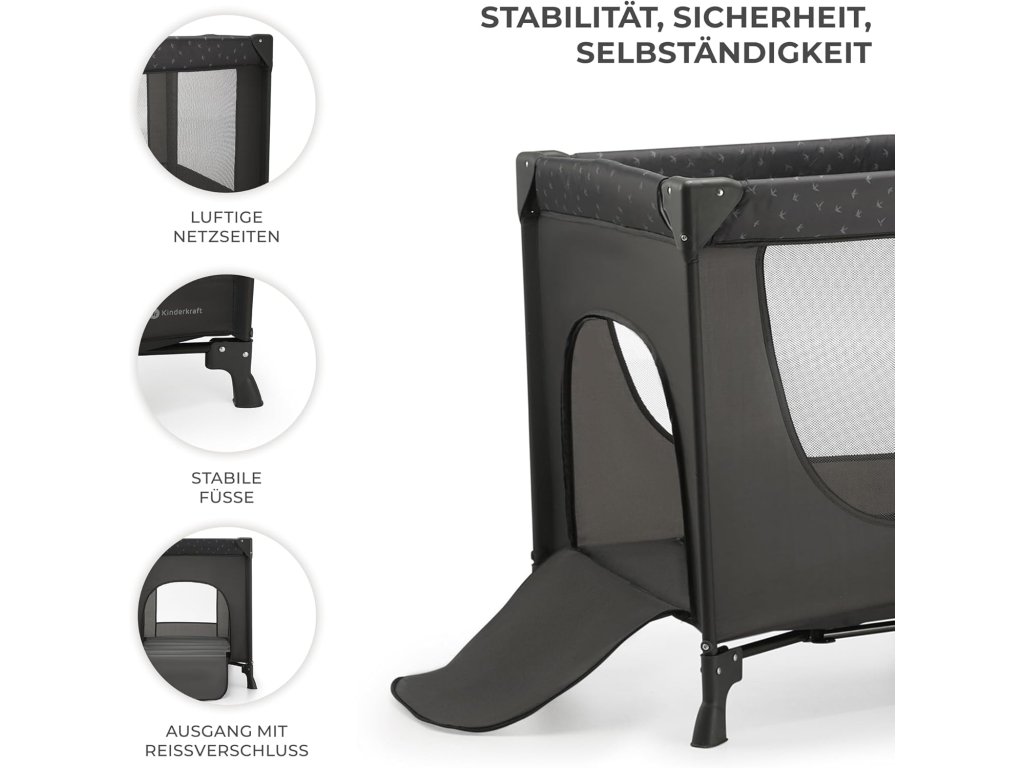 Postýlka je vybavena prodyšnými síťovanými bočnicemi, které zajišťují dobrou cirkulaci vzduchu a umožňují mít dítě stále pod dohledem. Praktický boční vstup na zip ocení zejména starší děti, které si mohou samy vylézt a vlézt do postýlky.