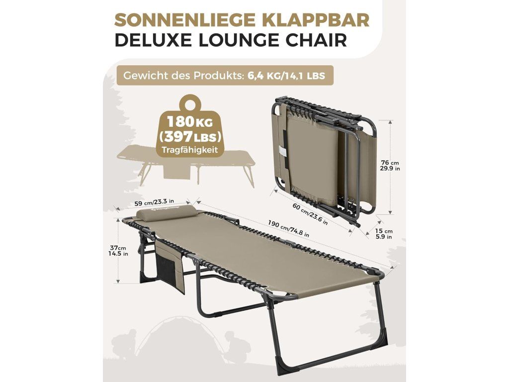 Rám je vyroben z pevné oceli a potah z odolného materiálu, který je prodyšný a snadno se udržuje. Konstrukce je skládací, takže lehátko lze jednoduše přenášet i skladovat.