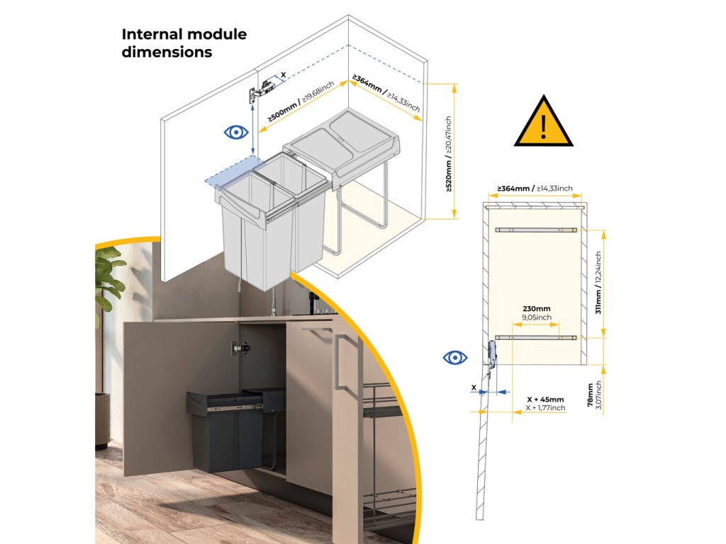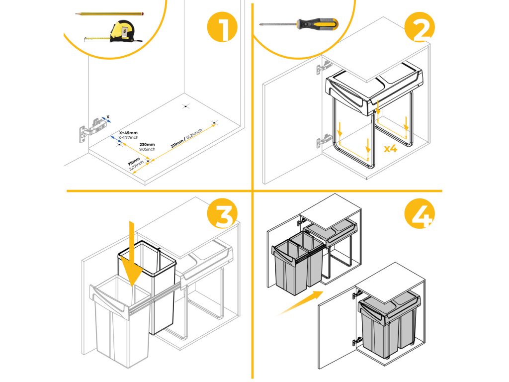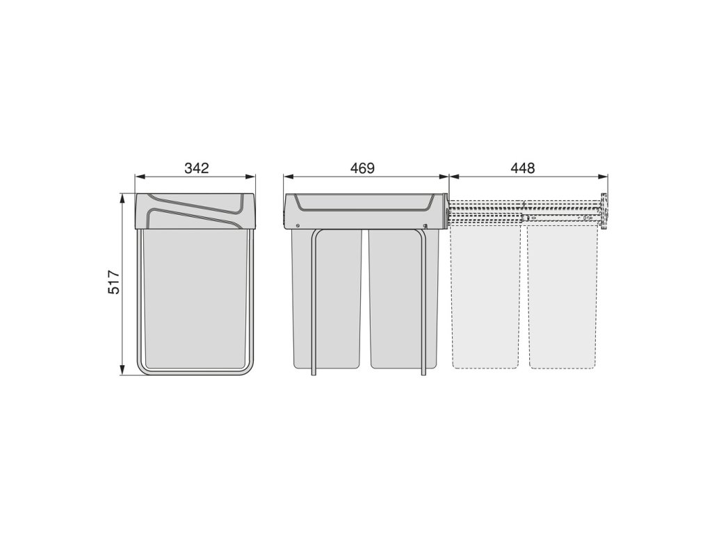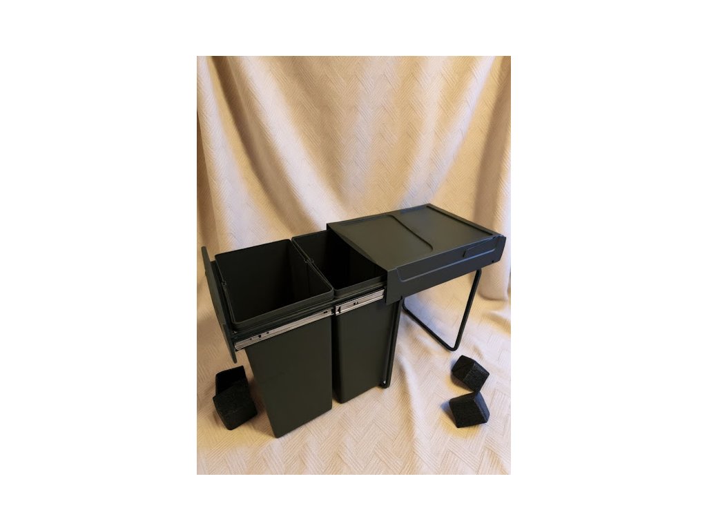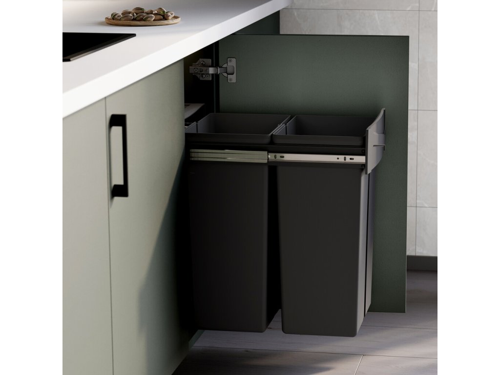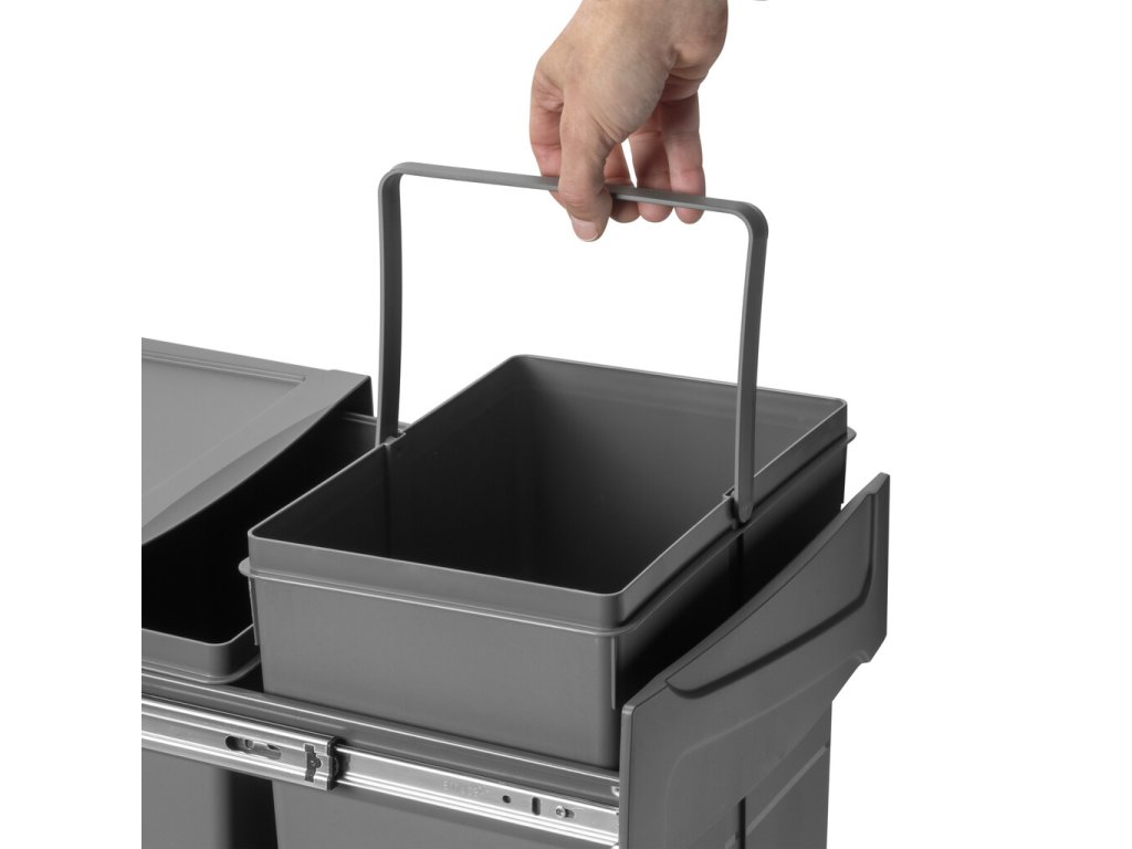 Vestavný koš na tříděný odpad se dvěma samostatnými nádobami o objemu 25 litrů je praktickým řešením pro moderní kuchyně. Koš je určen ke spodní montáži do kuchyňské skříňky a ovládá se ručním výsuvem.