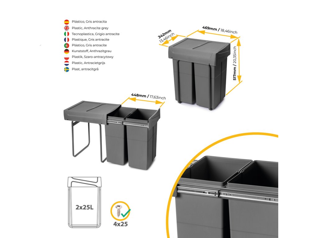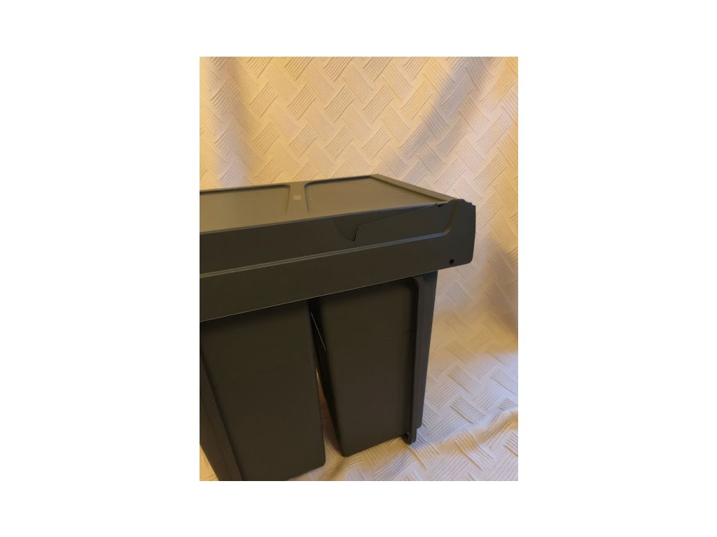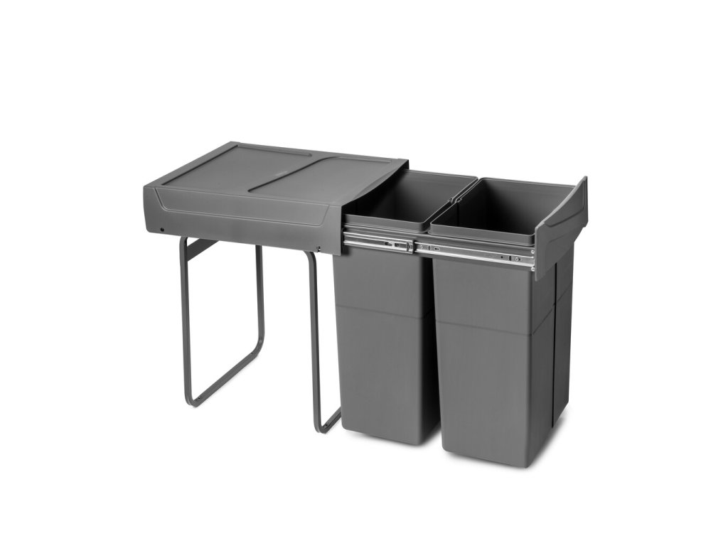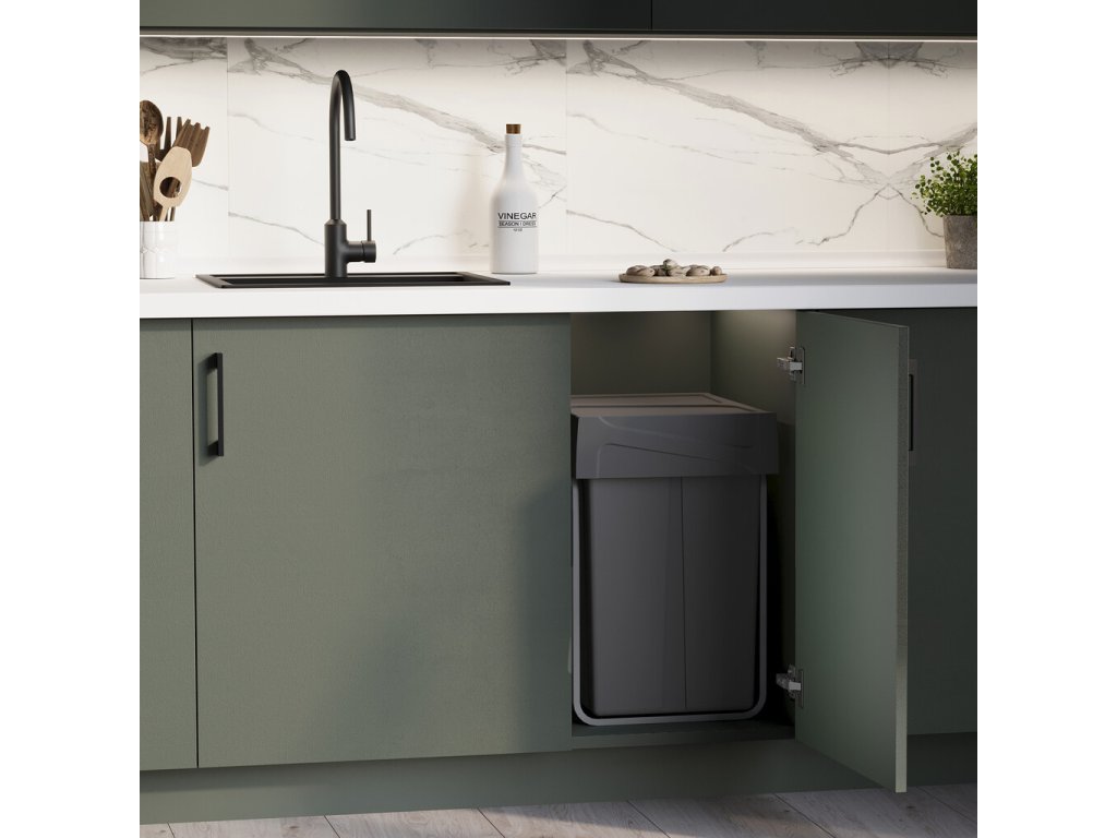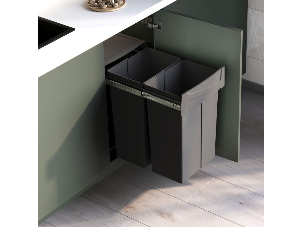 Konstrukce umožňuje pohodlný přístup k oběma nádobám a snadné třídění odpadu přímo při vaření. Pevné plastové nádoby jsou odolné, snadno vyjímatelné a jednoduše omyvatelné. Antracitově šedé provedení působí elegantně a hodí se k většině kuchyňských interiérů.