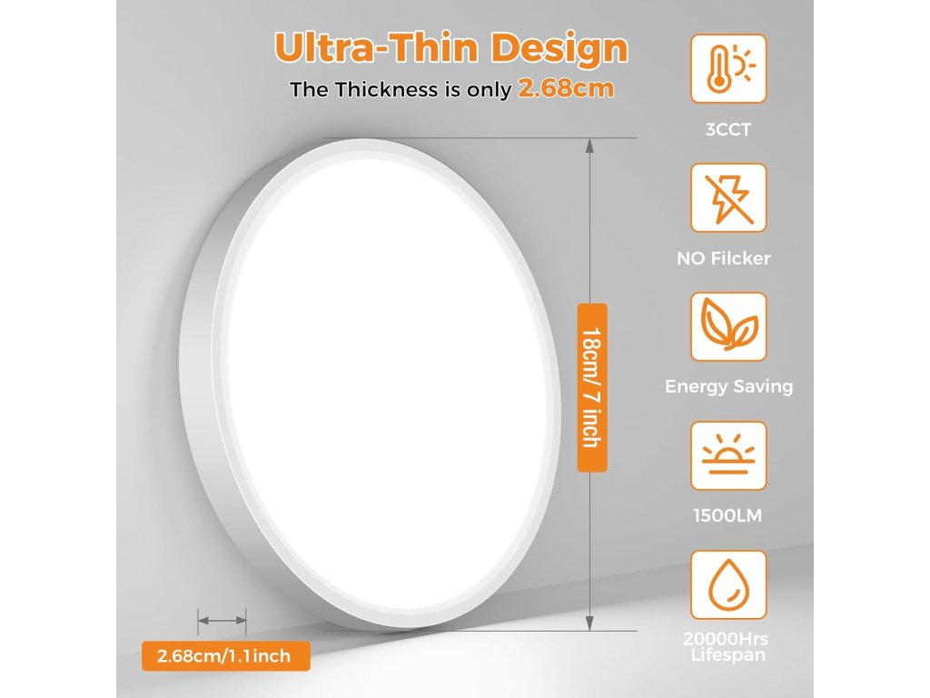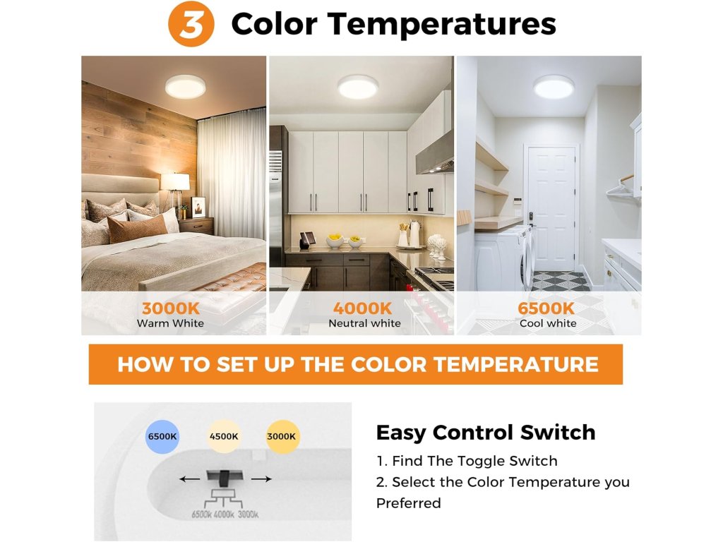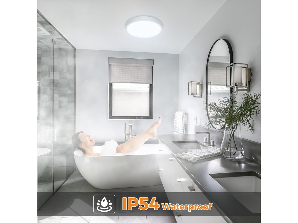 Moderní stropní LED svítidlo Slochi model CLS15 nabízí tři volitelné teploty světla – teplá bílá (3000K), neutrální bílá (4000K) a studená bílá (6500K). Díky krytí IP54 je ideální pro použití v koupelnách, kuchyních i dalších vlhkých prostorách. Svítidlo poskytuje rovnoměrné, jasné a příjemné osvětlení bez blikání.