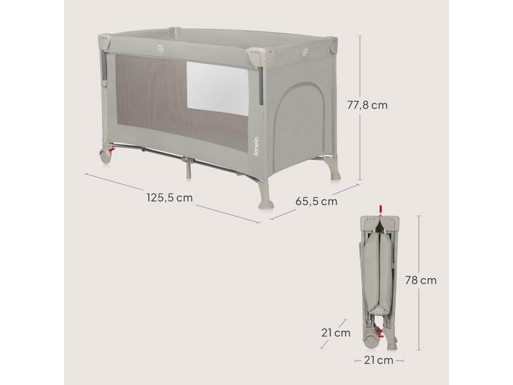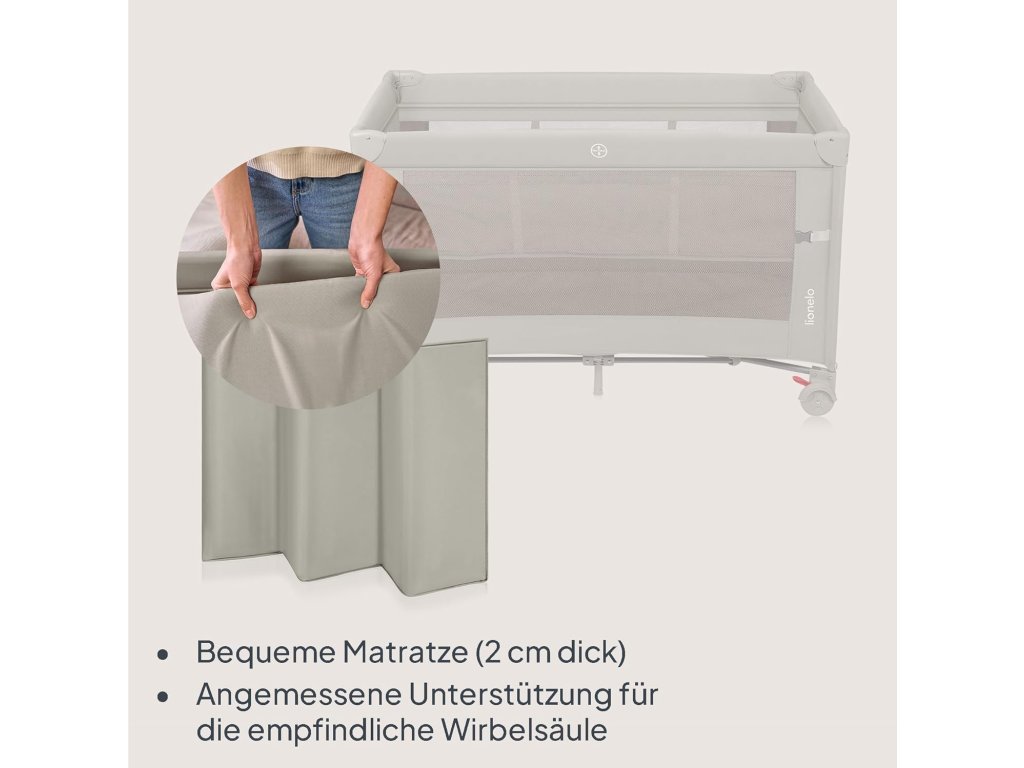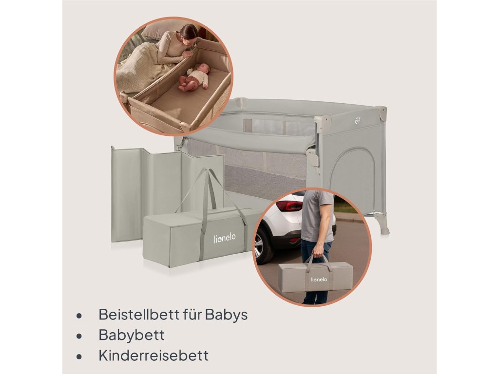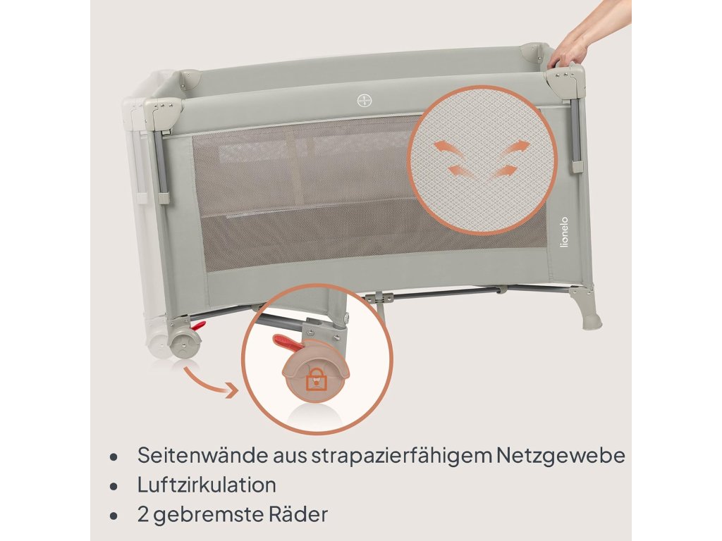 Lionelo Ellen 3 v 1 je praktická a bezpečná cestovní postýlka navržená pro děti od narození až do 3 let. Díky promyšlené konstrukci ji lze používat jako přistýlku k posteli rodičů, samostatné lůžko pro novorozence i klasickou cestovní postýlku pro starší děti.