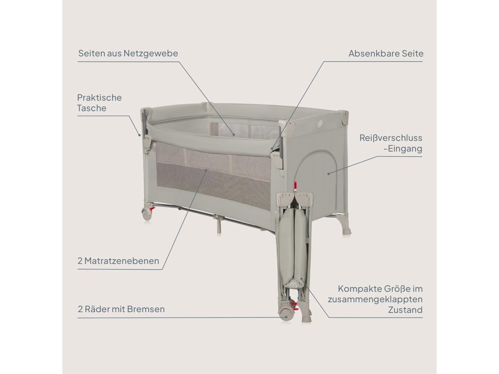 Postýlka nabízí dvě úrovně výšky matrace, což umožňuje ergonomickou manipulaci s miminkem i bezpečné používání pro batolata. Boční vstup na zip usnadňuje starším dětem samostatné vylézání a zalézání. Síťované bočnice zajišťují dobré proudění vzduchu a neustálý vizuální kontakt s dítětem.