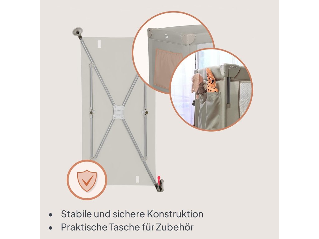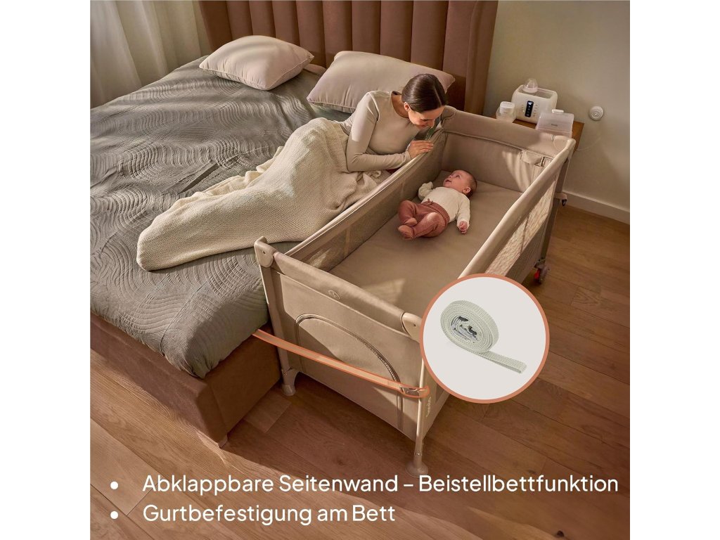 Součástí jsou dvě kolečka s brzdou pro snadné přesouvání, upevňovací popruhy pro bezpečné připevnění k posteli rodičů a praktická taška pro pohodlné cestování a skladování.
