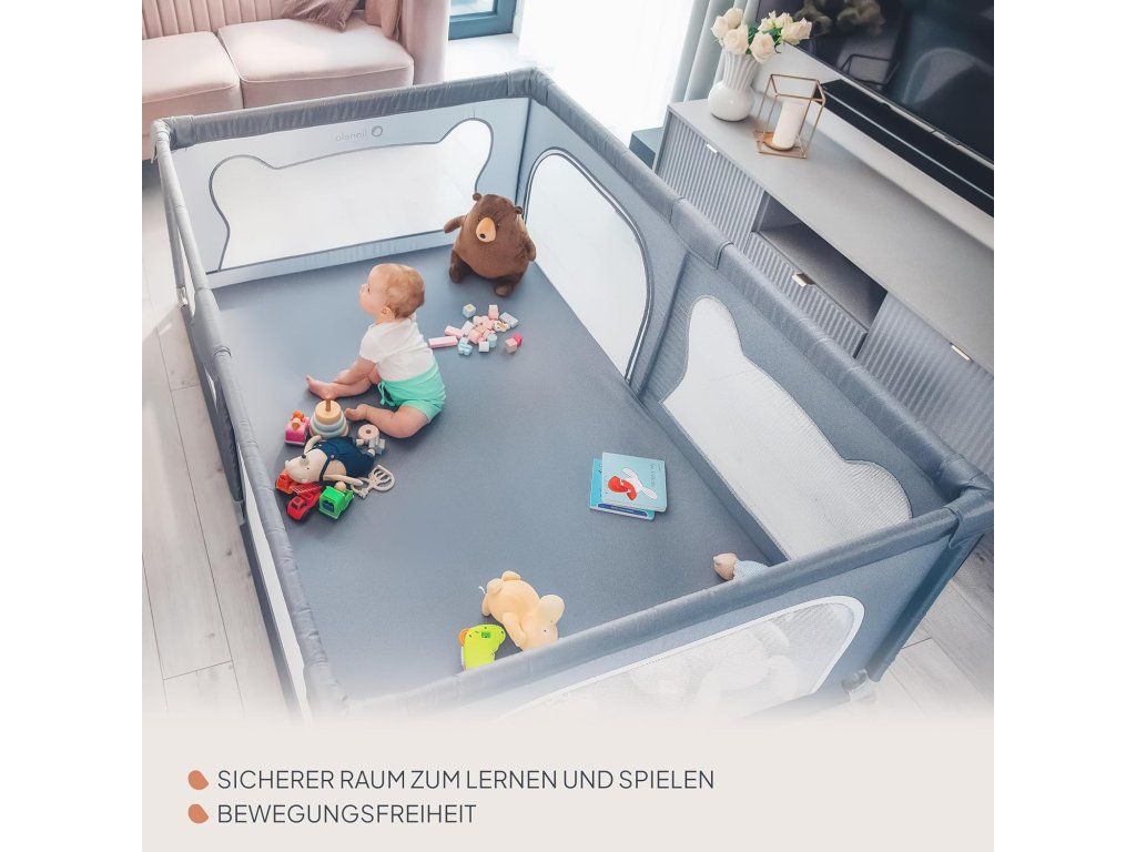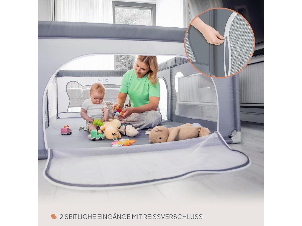 Ohrádka je vybavena prodyšnými bočními stěnami z odolné síťoviny, které zajišťují výbornou cirkulaci vzduchu a umožňují rodičům mít dítě neustále pod dohledem. Dva boční vstupy na zip ocení zejména starší děti, které mohou ohrádku samostatně opouštět a vracet se do ní.