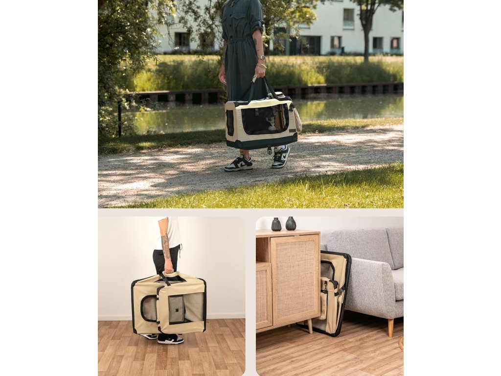 Díky skládací konstrukci lze box během několika sekund složit naplocho, což usnadňuje skladování i přepravu. Pevná madla a praktická boční kapsa zvyšují komfort při používání. Ideální volba pro malé a středně velké psy.