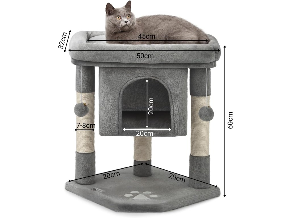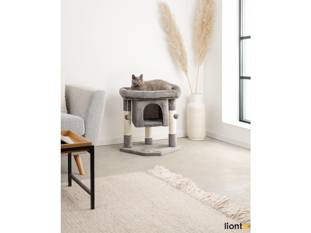 Kompaktní a stabilní kočičí strom, který nabízí ideální kombinaci odpočinku, hry i péče o drápky. Díky výšce 60 cm je vhodný do menších prostor, ale poskytuje dostatek místa i pro větší kočky.