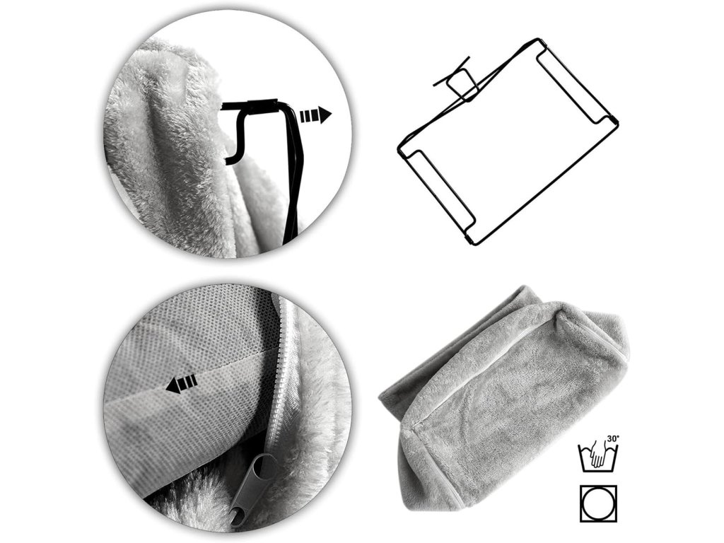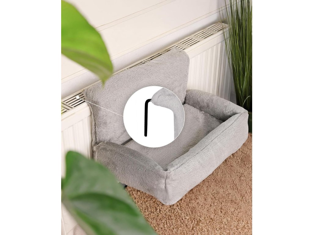 Lehátko je potaženo hebkým plyšovým materiálem, který je velmi příjemný na dotek a poskytuje maximální komfort při odpočinku i spánku. Stabilní kovový rám s háčky umožňuje bezpečné uchycení na většinu běžných radiátorů.