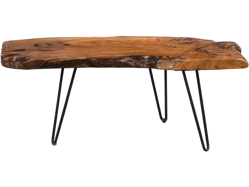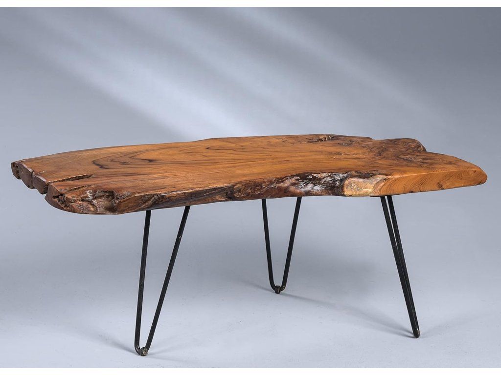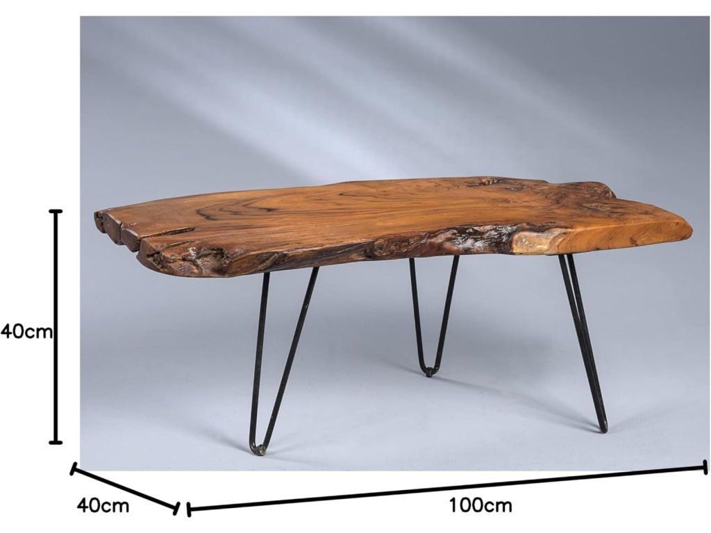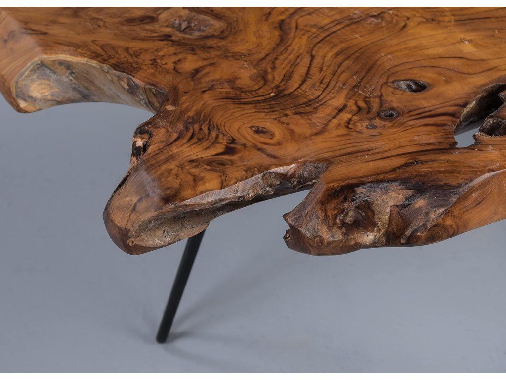 Kombinace přírodního teaku a černých kovových nohou vytváří elegantní kontrast mezi rustikálním a moderním stylem. Nepravidelný tvar desky zaručuje, že každý stolek je naprostý originál.
