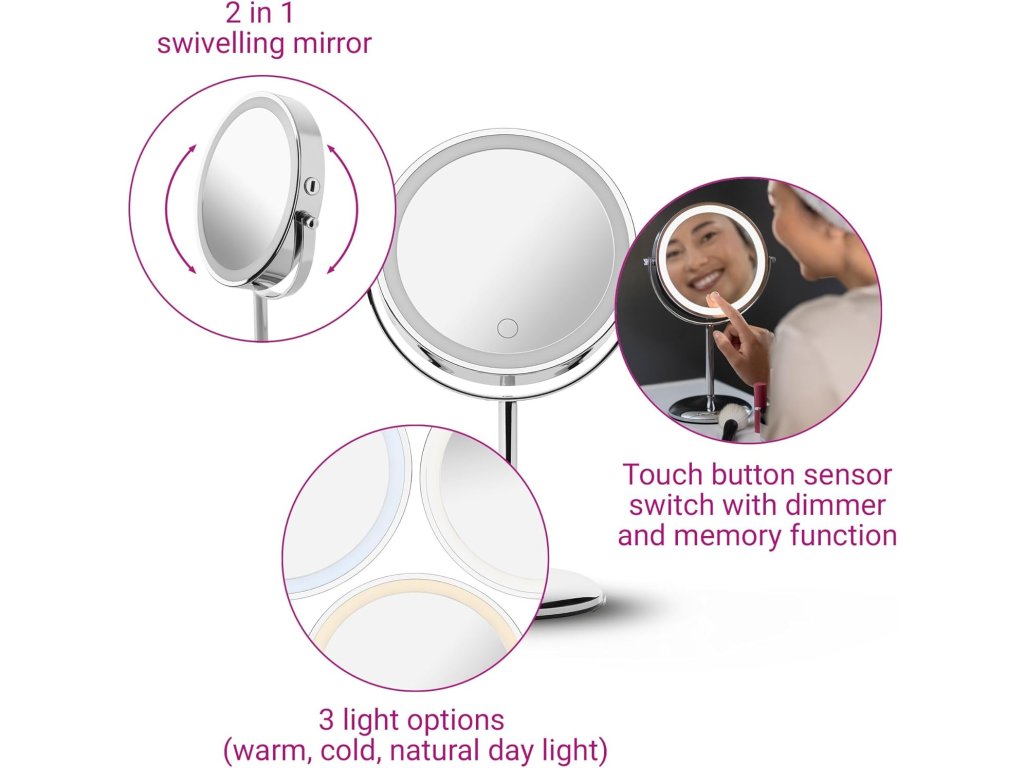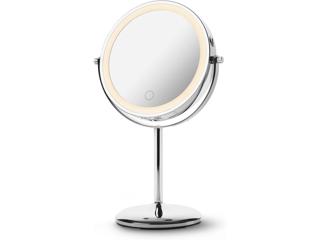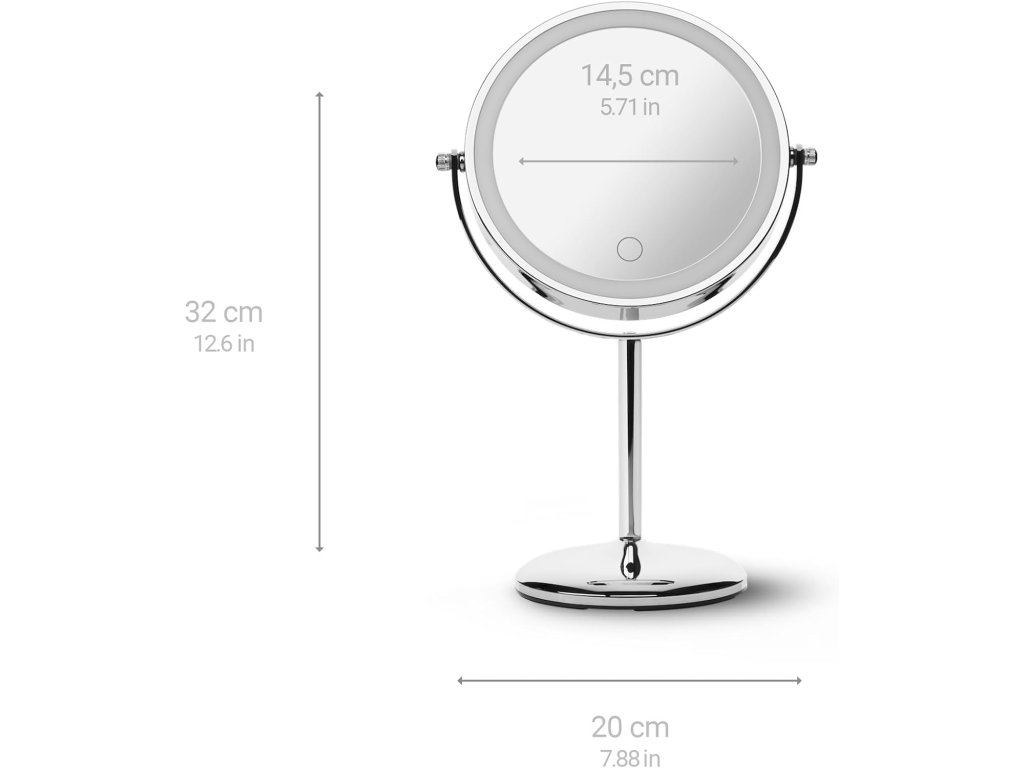 - Elegantní chromový design: Kompaktní a volně stojící zrcadlo o rozměrech 14,5 cm se plynule naklání na stabilním stojanu a vylepší tak toaletní stolek, koupelnu nebo stůl v moderním stylu.