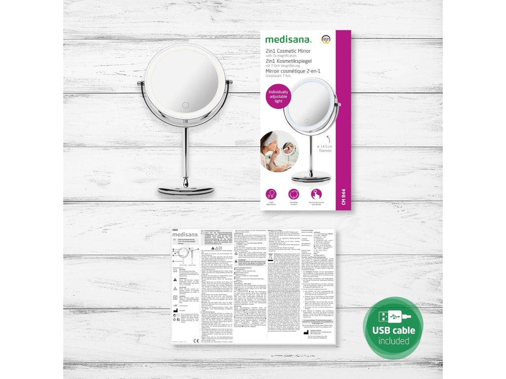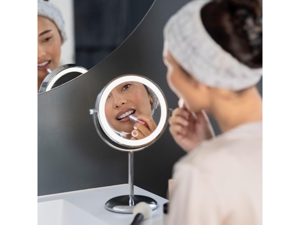 Medisana CM 844 je elegantní stolní kosmetické zrcátko s dvojicí zrcadel – jedním běžným a druhým se 7× zvětšením pro detailní líčení a péči o pleť. Díky LED osvětlení ve třech světelných režimech (teplé, studené, neutrální) a dotykovému stmívání si přizpůsobíte světlo podle potřeby. Zrcátko má vestavěný dobíjecí akumulátor s výdrží až ~120 min a automatickým vypnutím po 30 min.