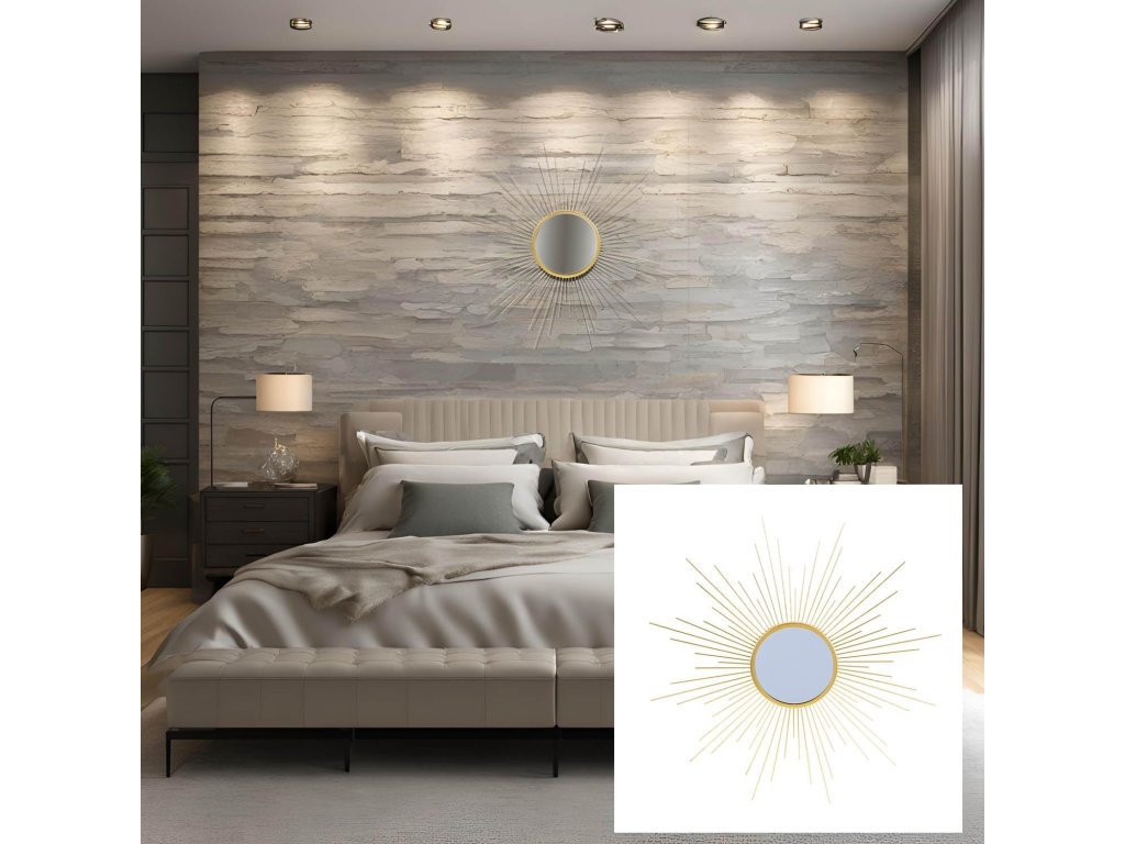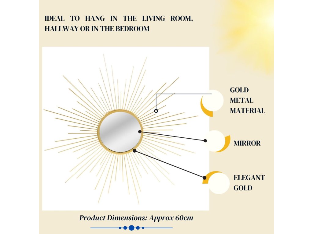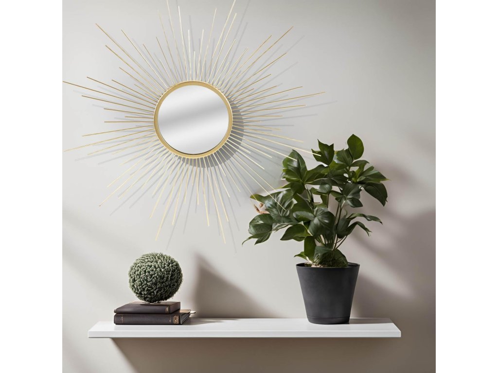 Nástěnné zrcadlo Urban Living Design Sun Gold Home vyniká originálním designem ve tvaru slunce a luxusním zlatým provedením. Jemné kovové paprsky dodávají prostoru eleganci a opticky jej projasňují. Zrcadlo je ideální volbou do obývacího pokoje, ložnice, předsíně i moderní kanceláře.