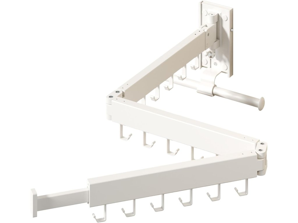 Součástí konstrukce jsou integrované háčky, které umožňují zavěšení ramínek, ručníků nebo doplňků. Po složení přiléhá věšák ke zdi a nenarušuje vzhled místnosti.